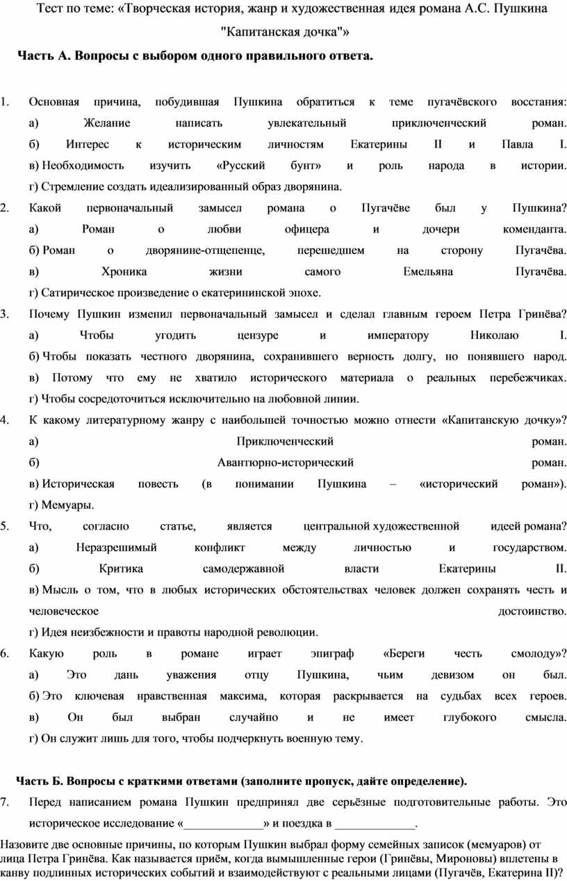 Тест по теме: «Творческая история, жанр и художественная идея романа А.С. Пушкина "Капитанская дочка"»