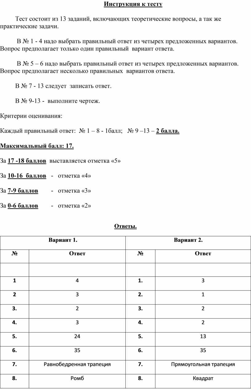 Тест состоит из 13 заданий, включающих теоретические вопросы, а так же практические задачи.