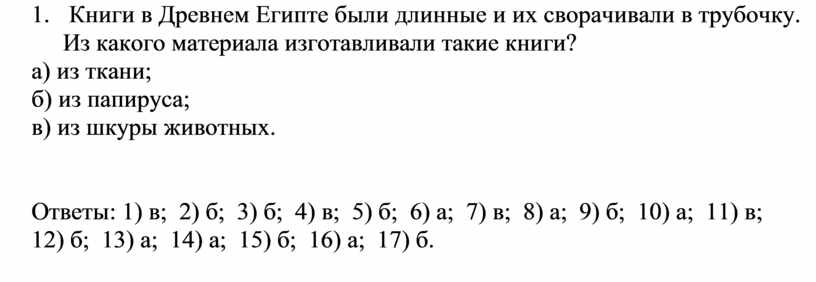 17. Книги в Древнем Египте были длинные и их сворачивали в трубочку. Из какого материала изготавливали такие книги?