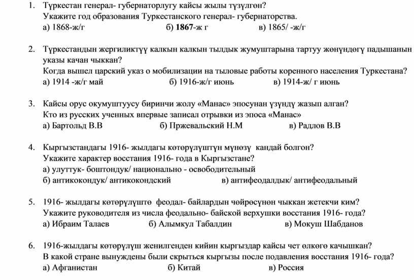 ТЕСТ ПО ИСТОРИИ КЫРГЫЗСТАНА
