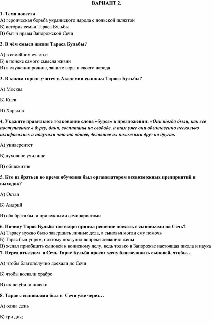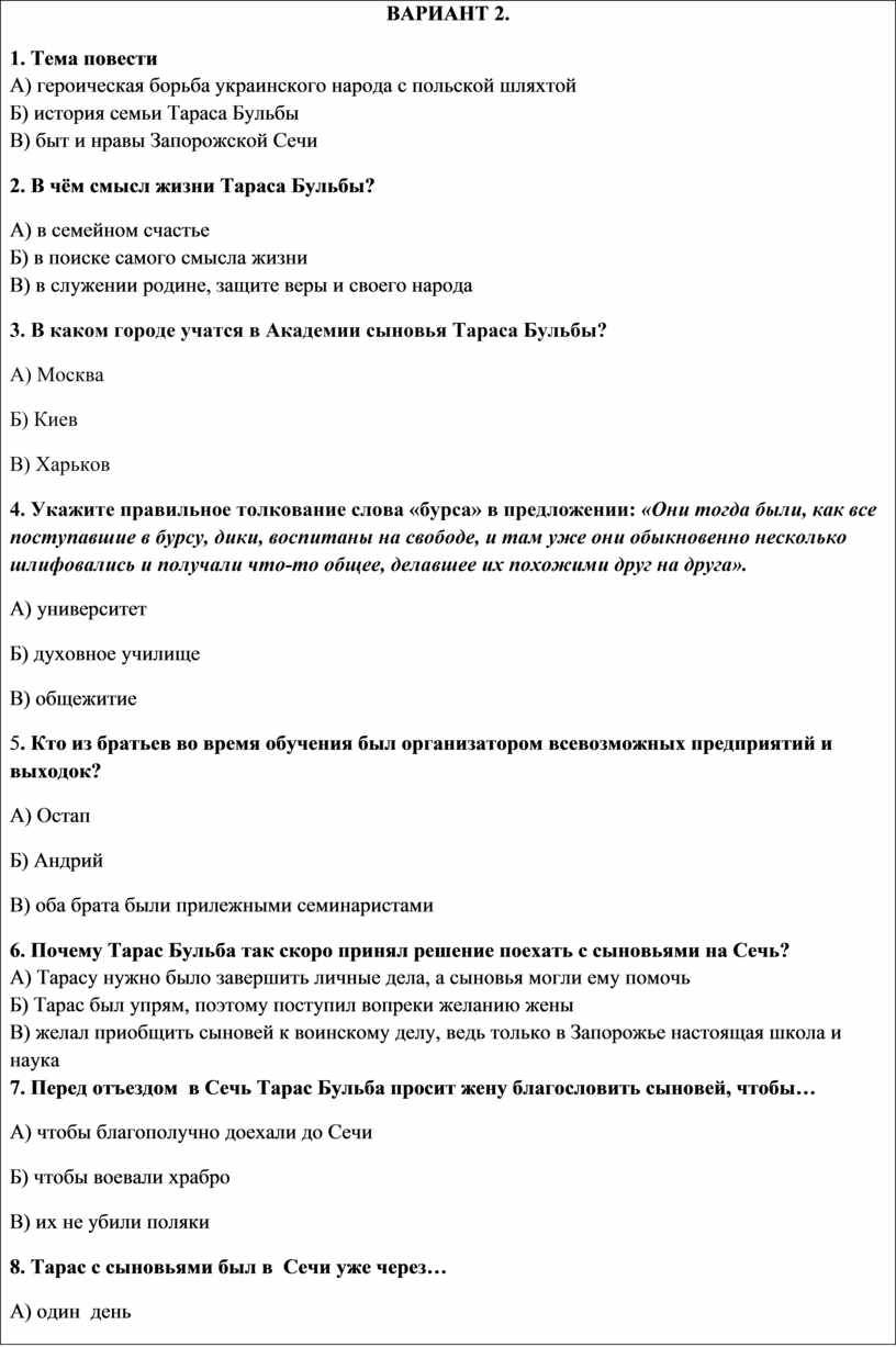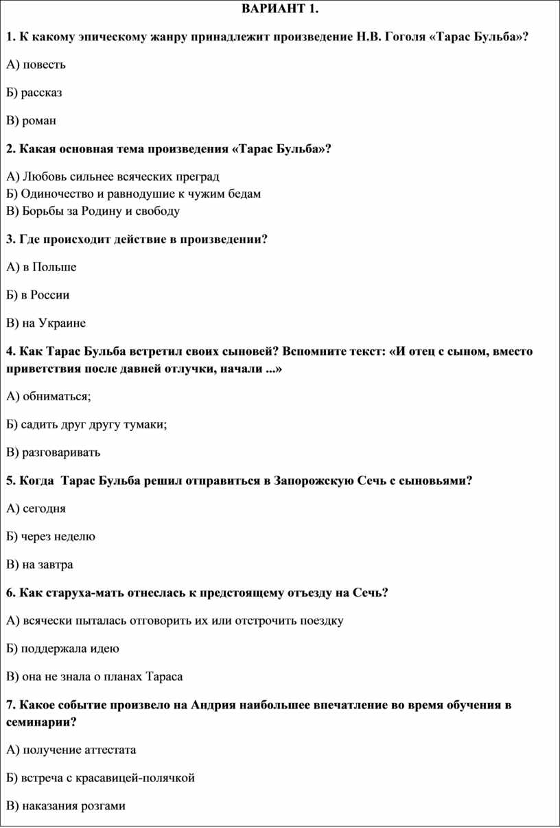 ВАРИАНТ 1. 1. К какому эпическому жанру принадлежит произведение Н.В. Гоголя «Тарас Бульба»? А) повесть Б) рассказ В) роман 2. Какая основная тема произведения «Тарас Бульба»? А)