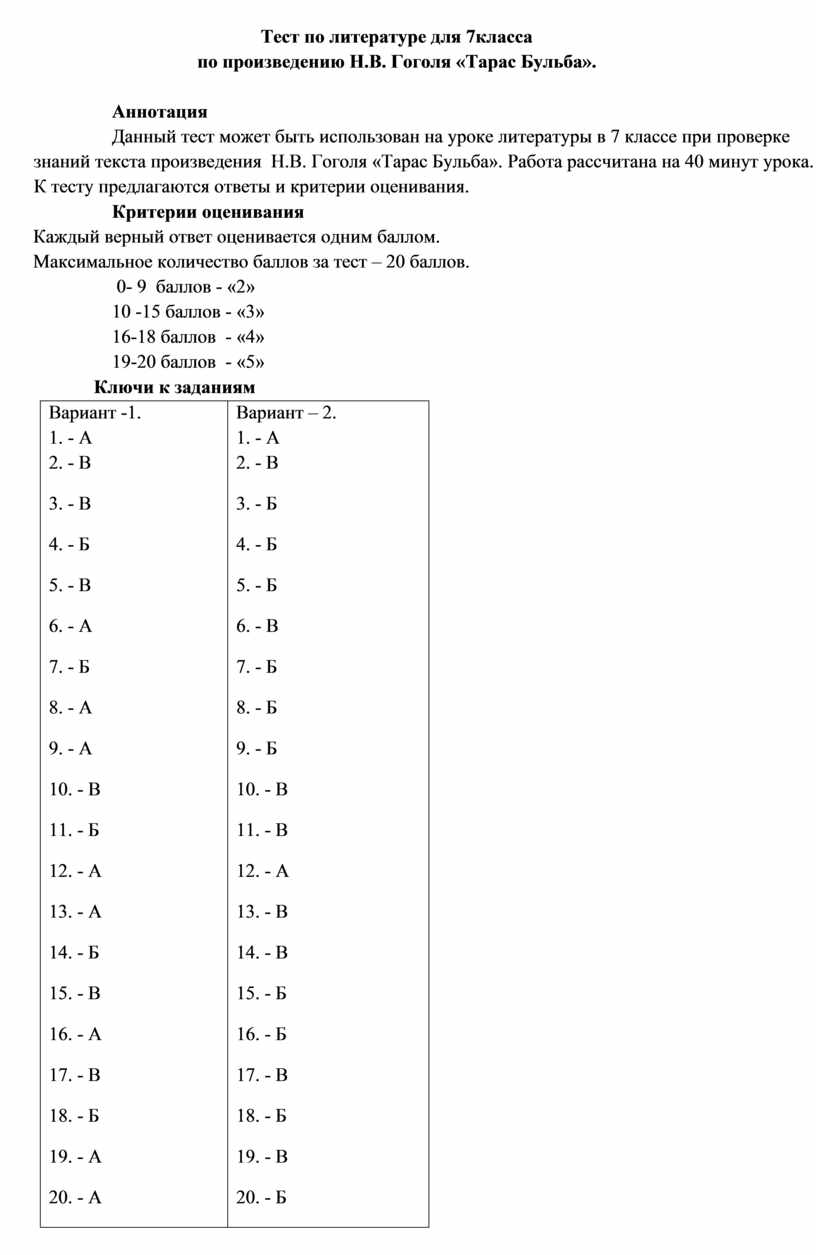 Данный тест может быть использован на уроке литературы в 7 классе при проверке знаний текста произведения Н.В. Гоголя «Тарас Бульба». Работа рассчитана на 40 минут урока. К тесту предлагаются ответы и критерии оценивания.