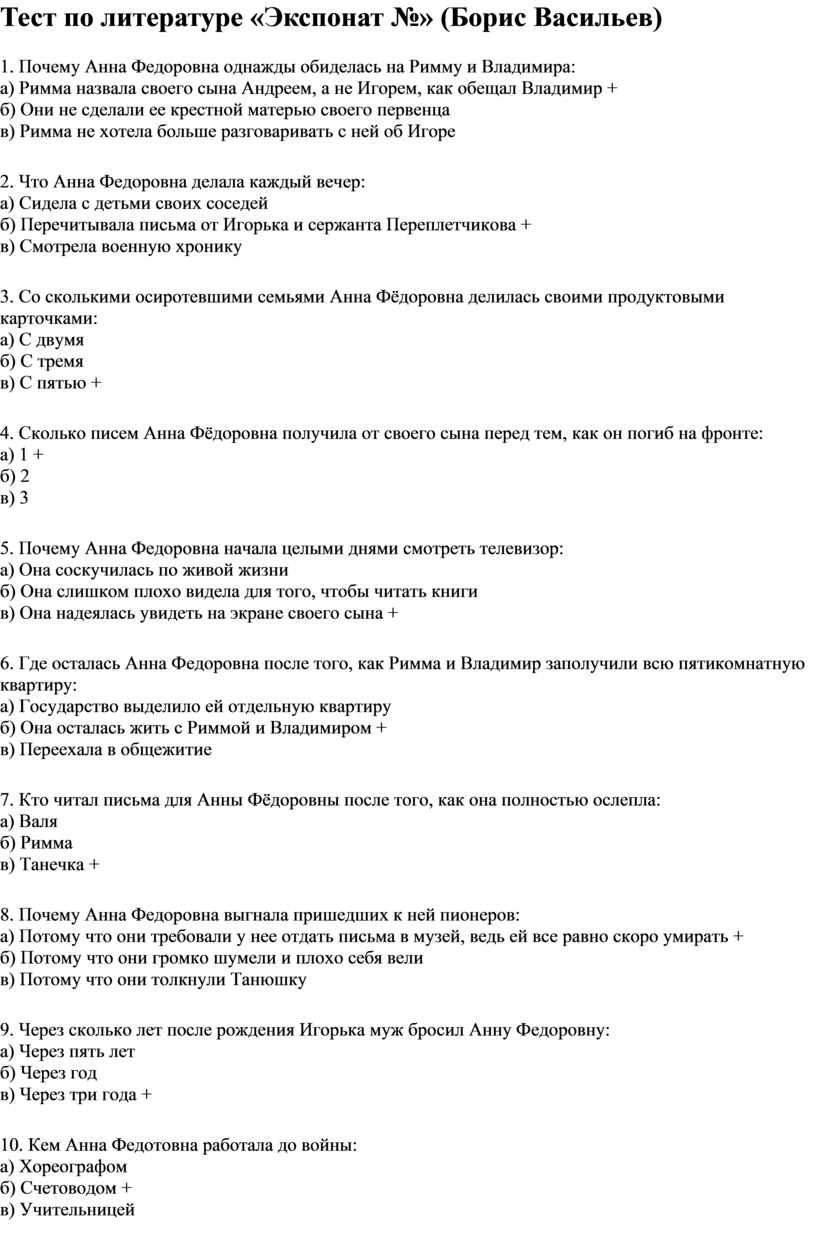 Тест по литературе «Экспонат №» (Борис Васильев)