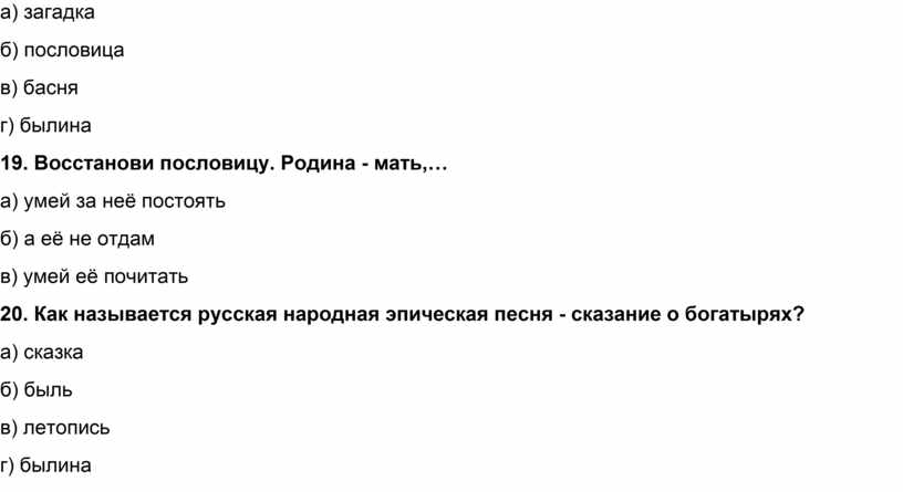 20. Как называется русская народная эпическая песня - сказание о богатырях?