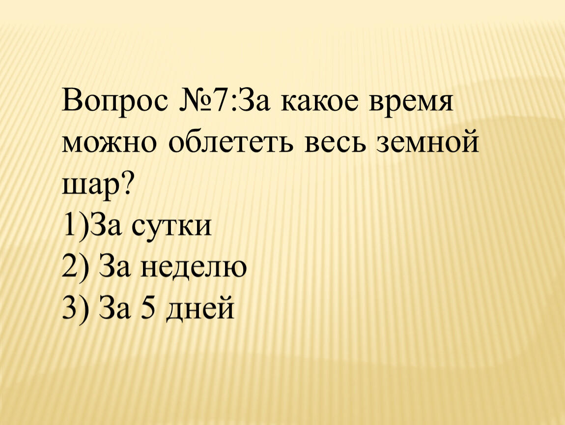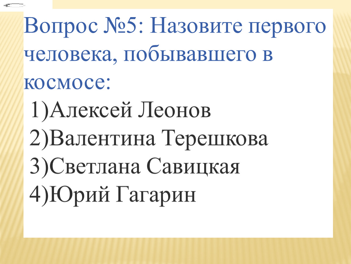 Вопрос №5: Назовите первого человека, побывавшего в космосе: 1)Алексей Леонов 2)Валентина Терешкова 3)Светлана Савицкая