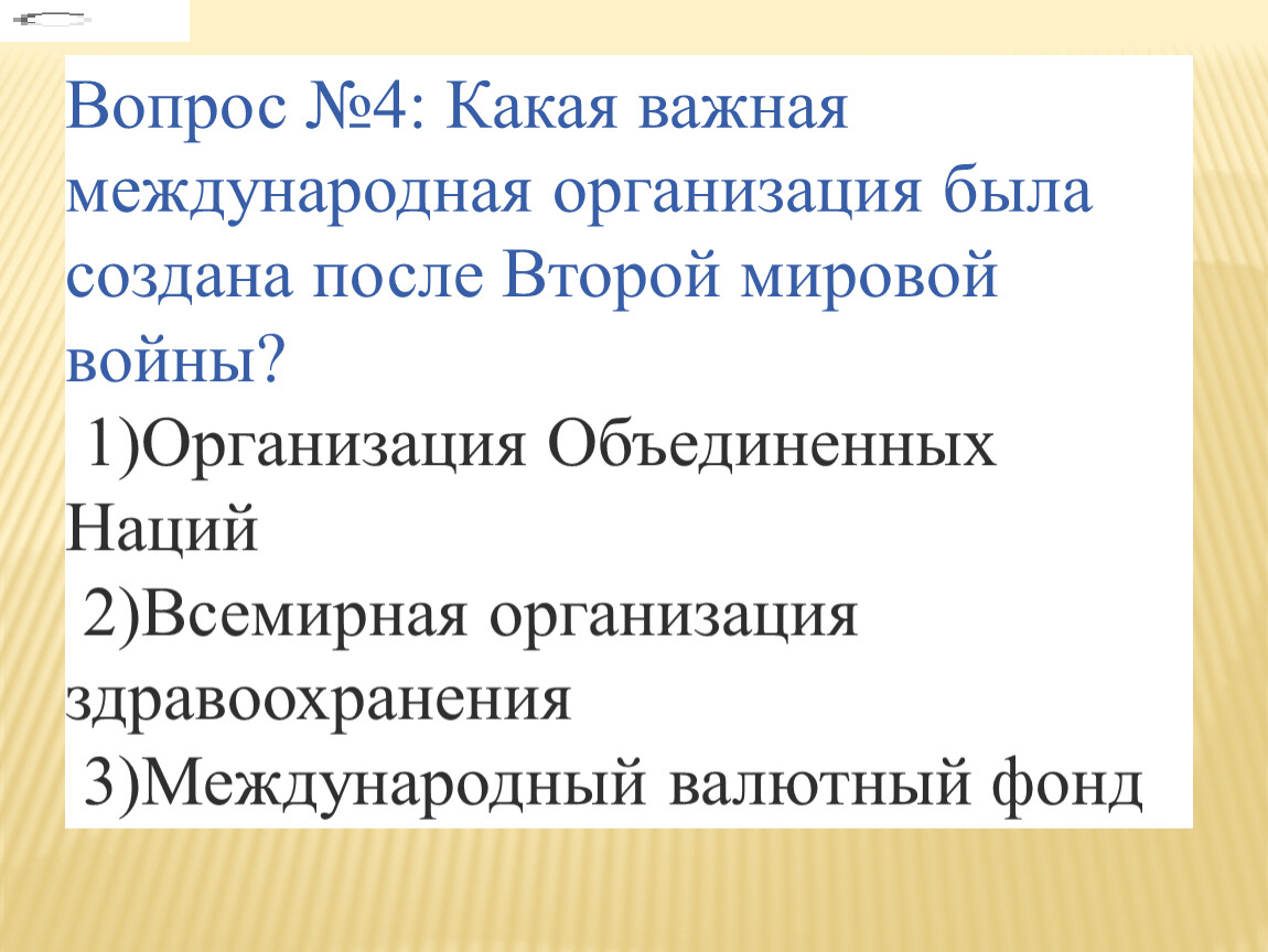 Вопрос №4: Какая важная международная организация была создана после Второй мировой войны?