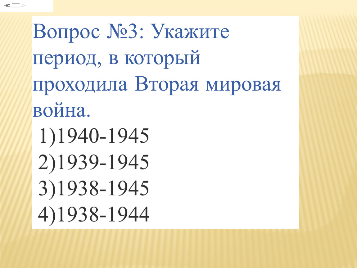 Вопрос №3: Укажите период, в который проходила Вторая мировая война.