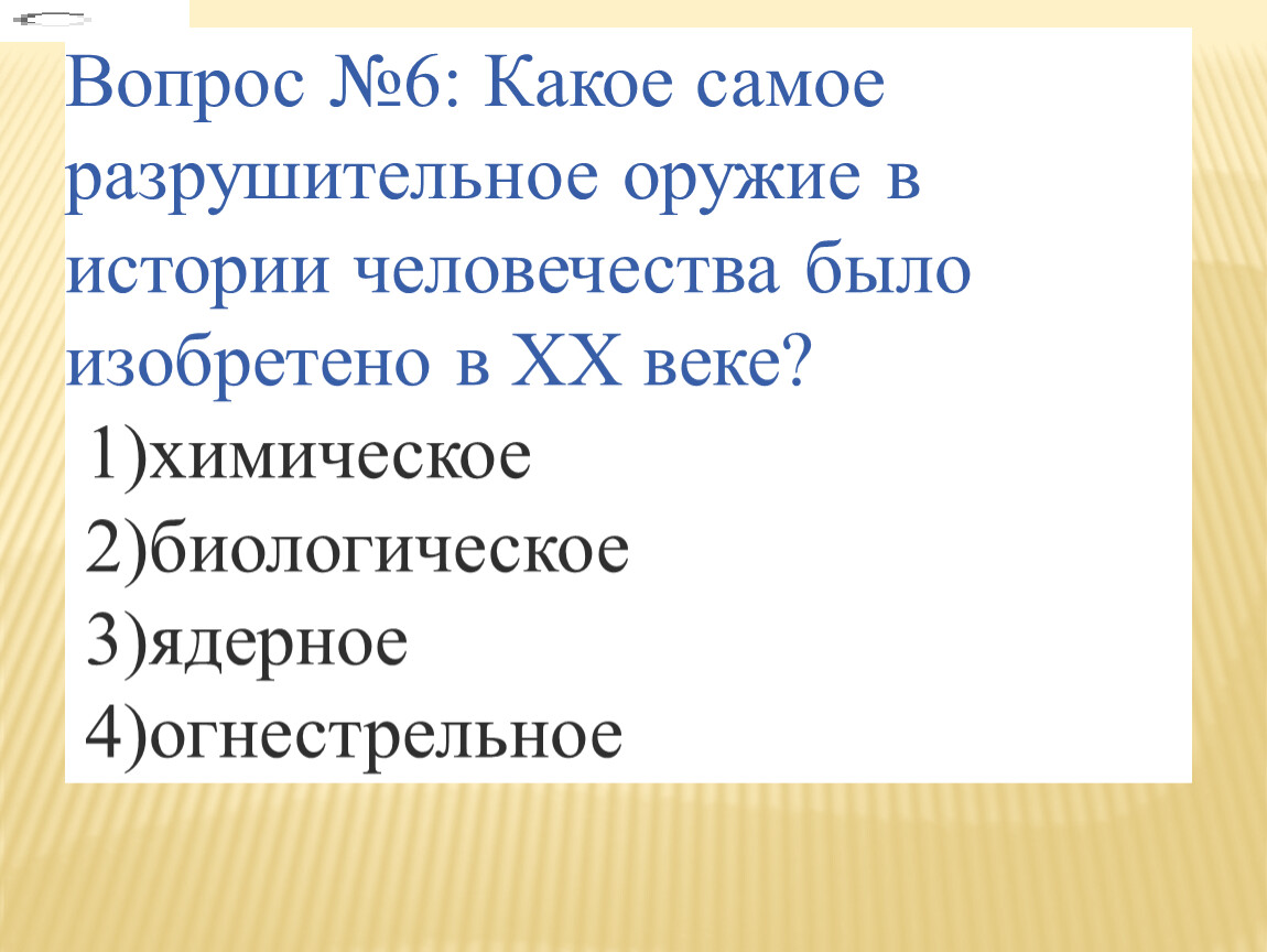 Вопрос №6: Какое самое разрушительное оружие в истории человечества было изобретено в ХХ веке?