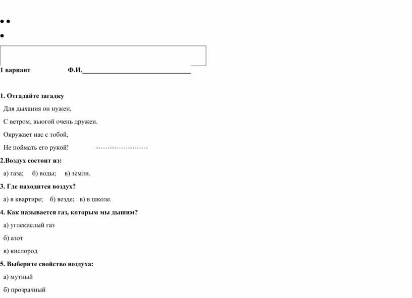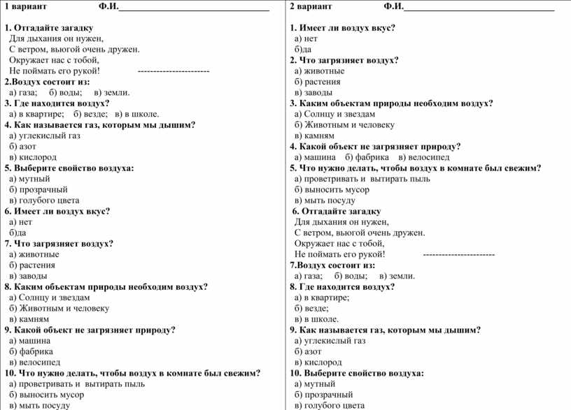 1. Отгадайте загадку Для дыхания он нужен, С ветром, вьюгой очень дружен. Окружает нас с тобой, Не поймать его рукой! ----------------------- 2.Воздух состоит из: а) газа; б) воды; в) земли. 3. Где находится воздух? а) в квартире; б) везде; в) в школе. 4. Как называется газ, которым мы дышим? а) углекислый газ б) азот в) кислород 5. Выберите свойство воздуха: а) мутный б) прозрачный в) голубого цвета 6. Имеет ли воздух вкус? а) нет б)да 7. Что загрязняет воздух? а) животные б) растения в) заводы 8. Каким объектам природы необходим воздух? а) Солнцу и звездам б) Животным и человеку в) камням 9. Какой объект не загрязняет природу? а) машина б) фабрика в) велосипед 10. Что нужно делать, чтобы воздух в комнате был свежим? а) проветривать и вытирать пыль б) выносить мусор в) мыть посуду