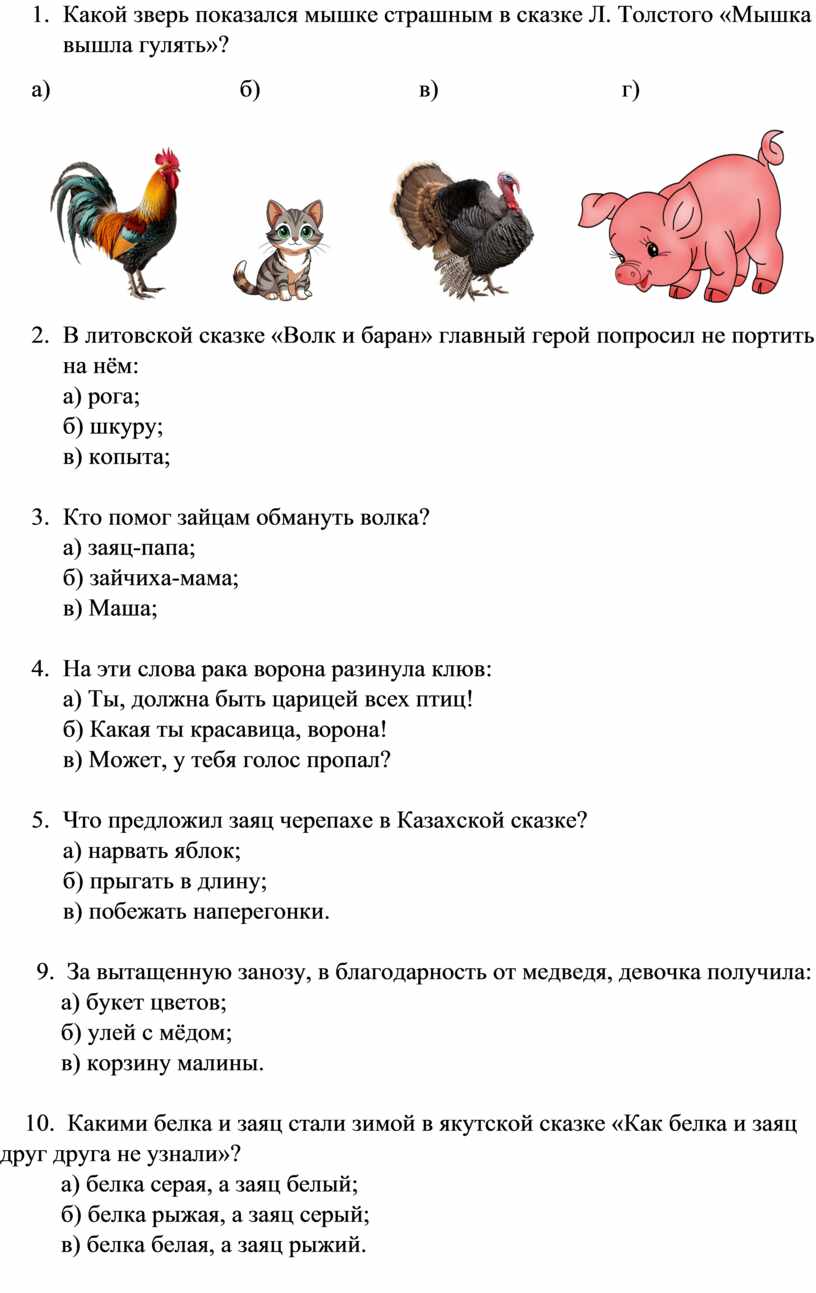 4. Какой зверь показался мышке страшным в сказке Л. Толстого «Мышка вышла гулять»?