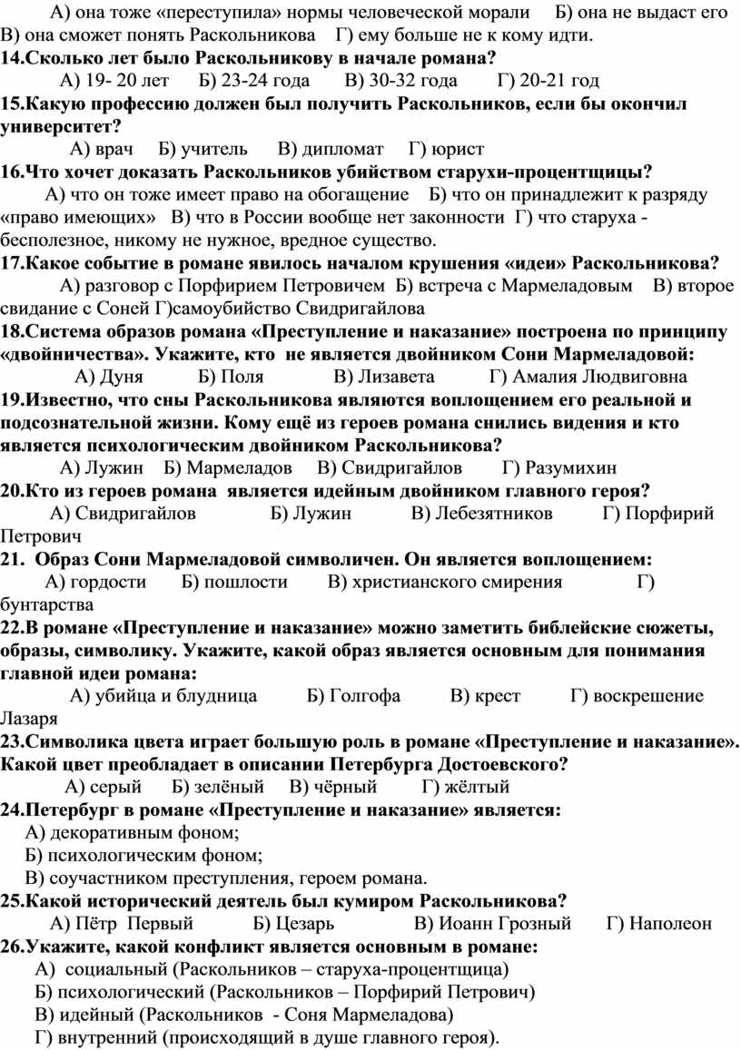 Тест по роману Ф.М.Достоевского «Преступление и наказание» 10 класс