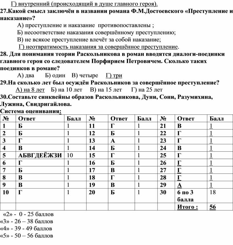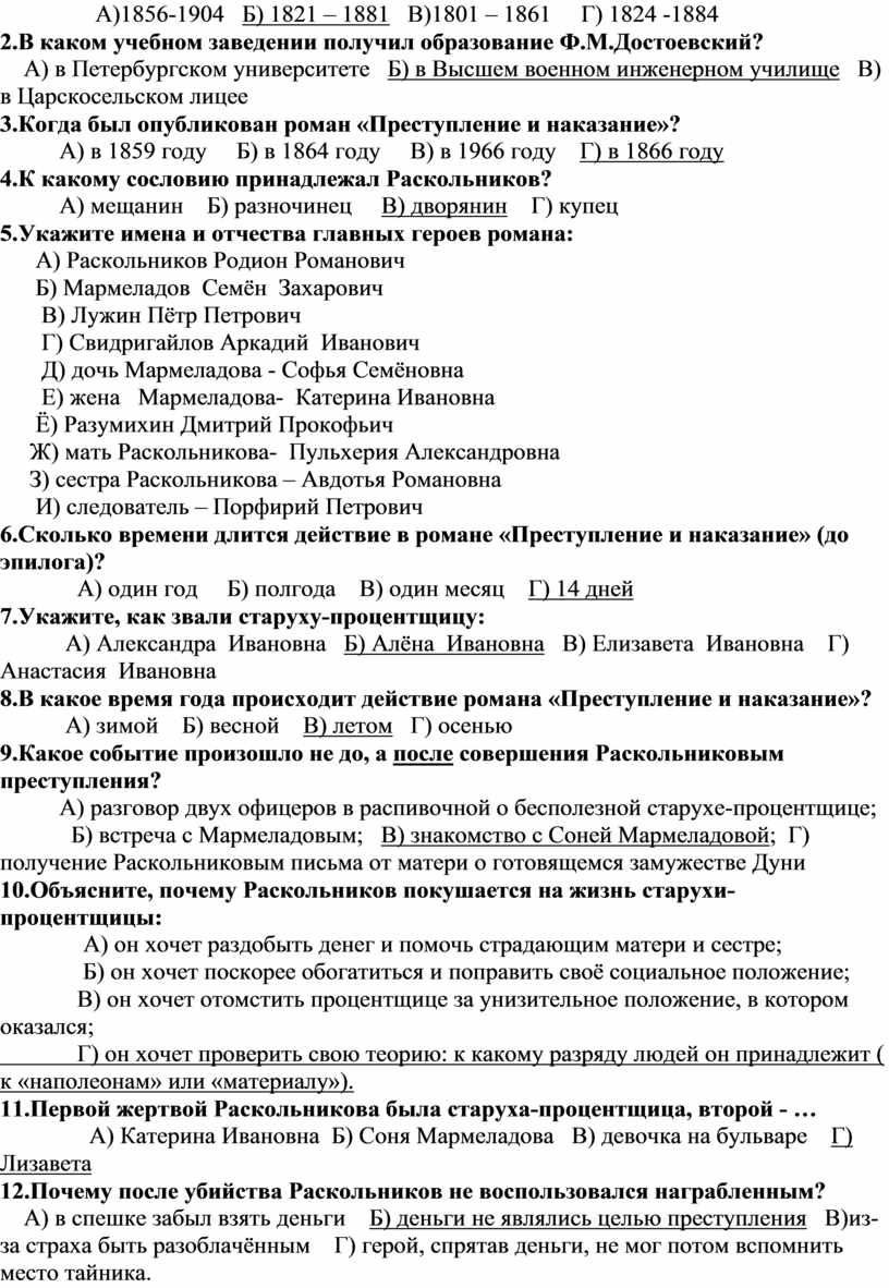 к тесту по роману Ф.М.Достоевского «Преступление и наказание» 10 класс