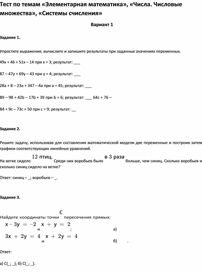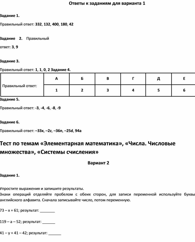 Тест по темам «Элементарная математика», «Числа. Числовые множества», «Системы счисления»
