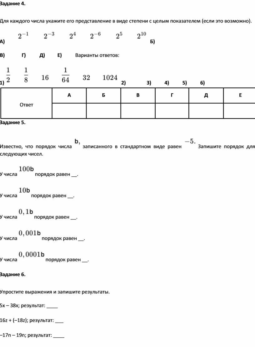 Для каждого числа укажите его представление в виде степени с целым показателем (если это возможно).