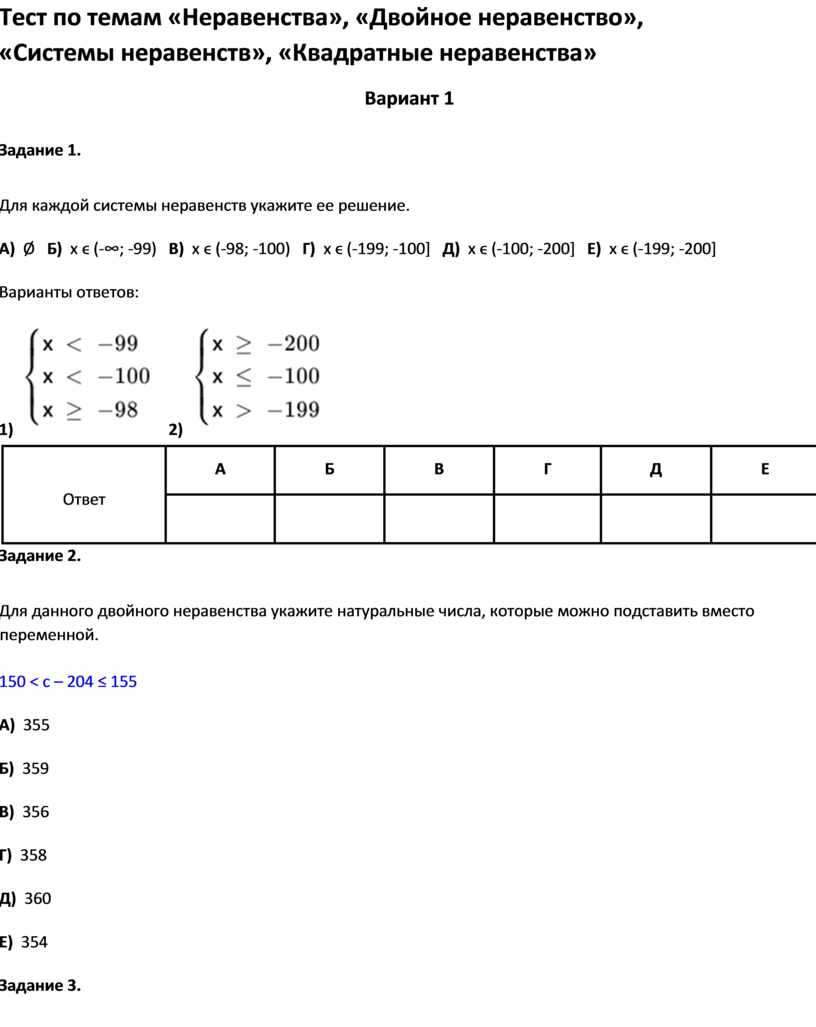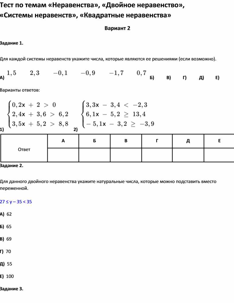 Тест по темам «Неравенства», «Двойное неравенство»,