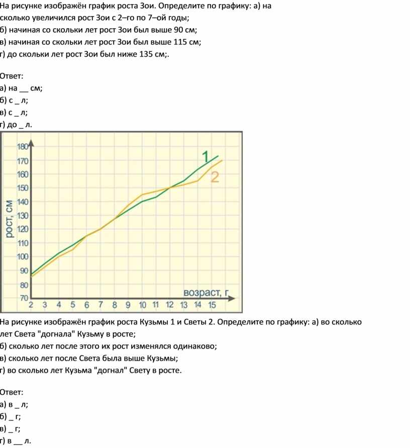 На рисунке изображён график роста Кузьмы 1 и Светы 2. Определите по графику: а) во сколько лет Света "догнала" Кузьму в росте;