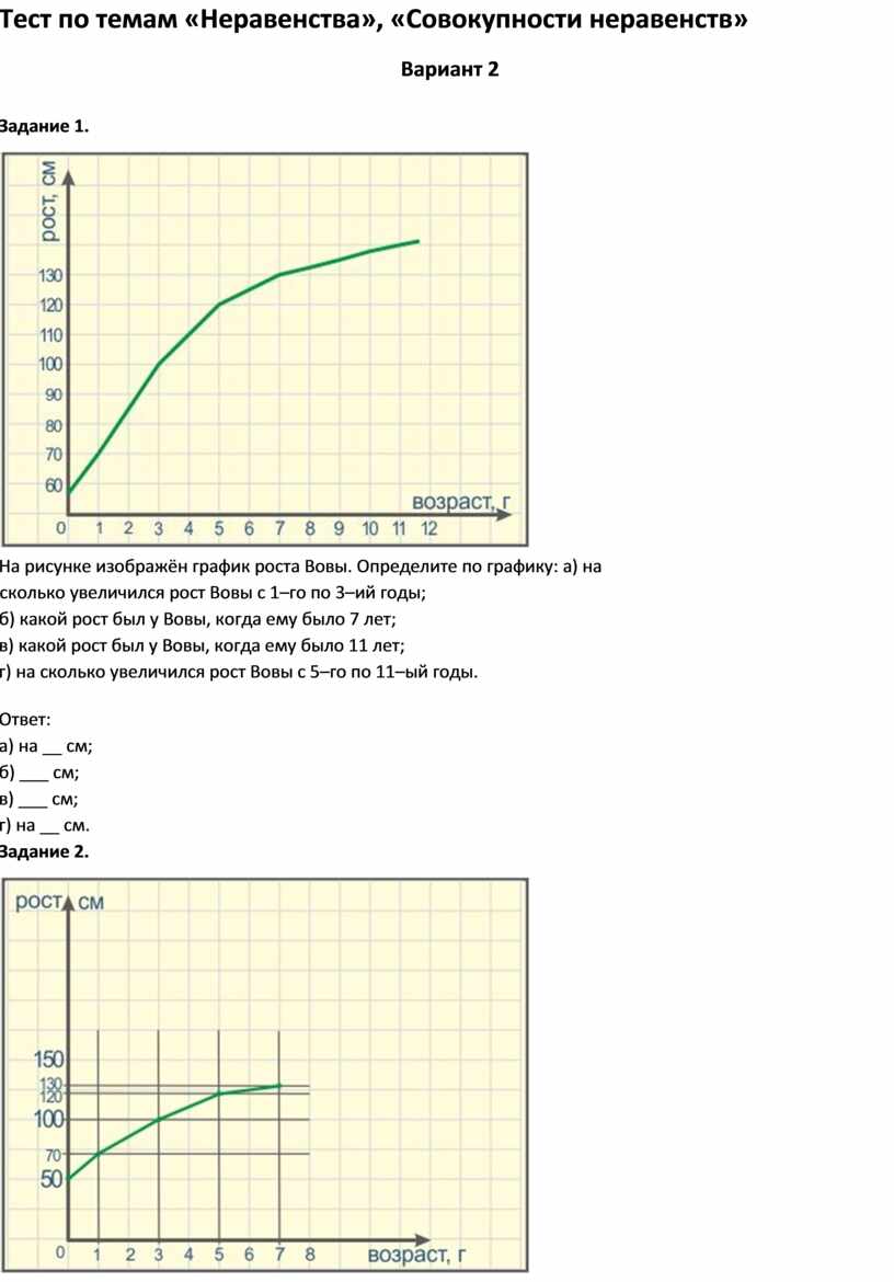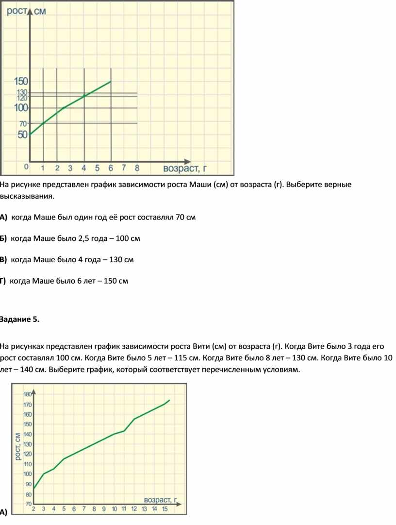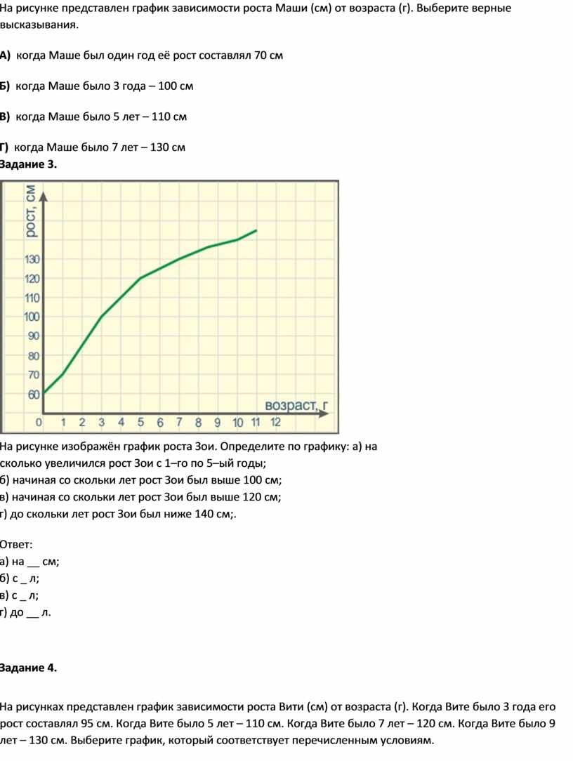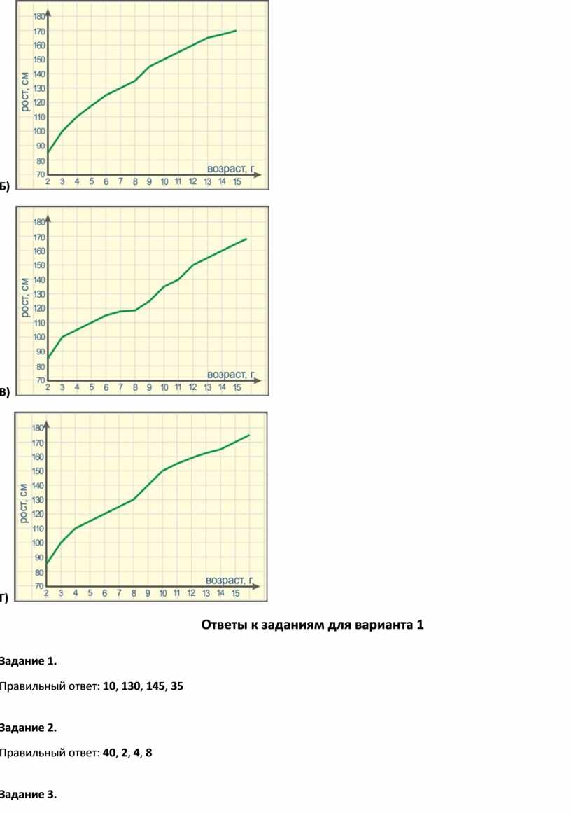 На рисунках представлен график зависимости роста Вити (см) от возраста (г). Когда Вите было 3 года его рост составлял 95 см. Когда Вите было 5 лет – 110 см. Когда Вите было 7 лет – 120 см. Когда Вите было 9 лет – 130 см. Выберите график, который соответствует перечисленным условиям.