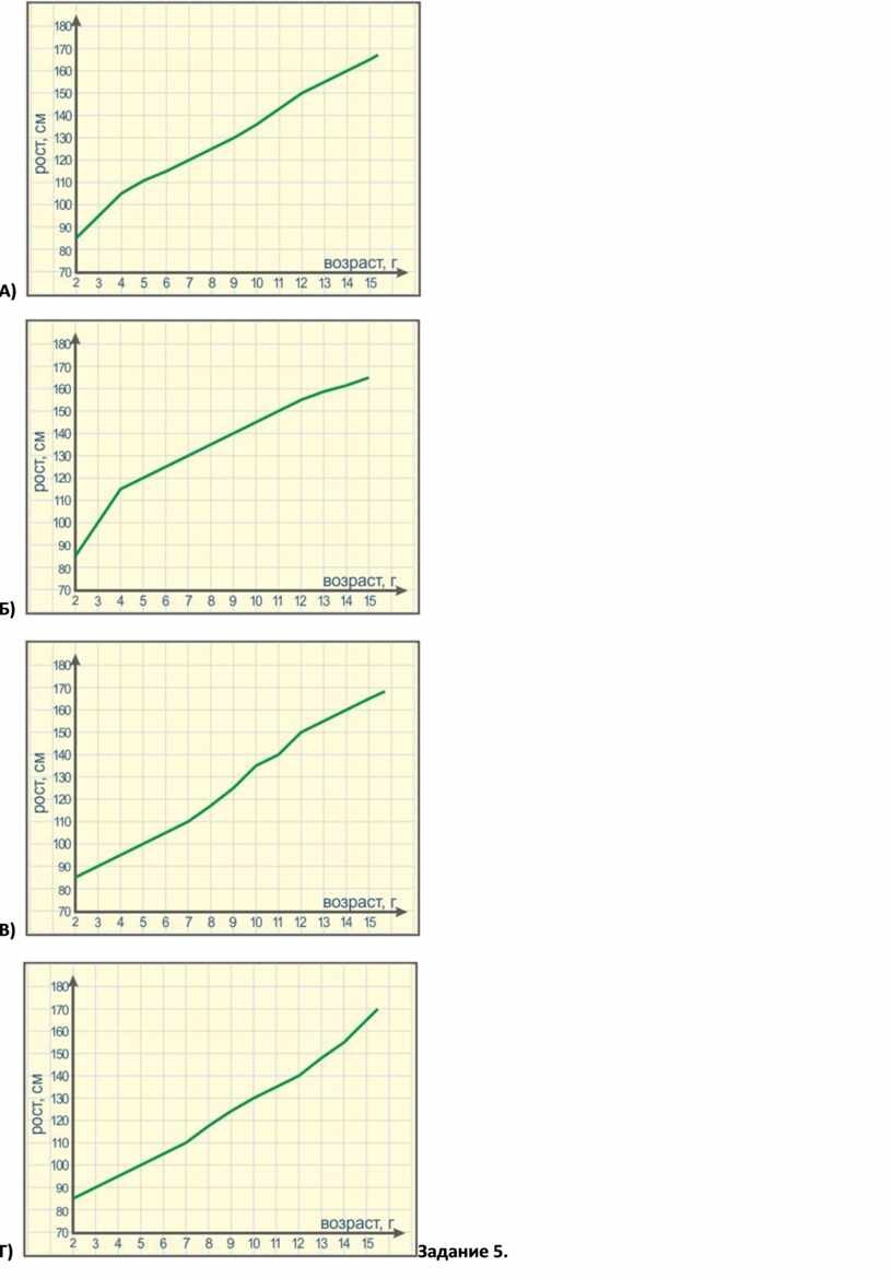 На рисунках представлен график зависимости роста Вити (см) от возраста (г). Когда Вите было 3 года его рост составлял 100 см. Когда Вите было 5 лет – 115 см. Когда Вите было 8 лет – 130 см. Когда Вите было 10 лет – 140 см. Выберите график, который соответствует перечисленным условиям.