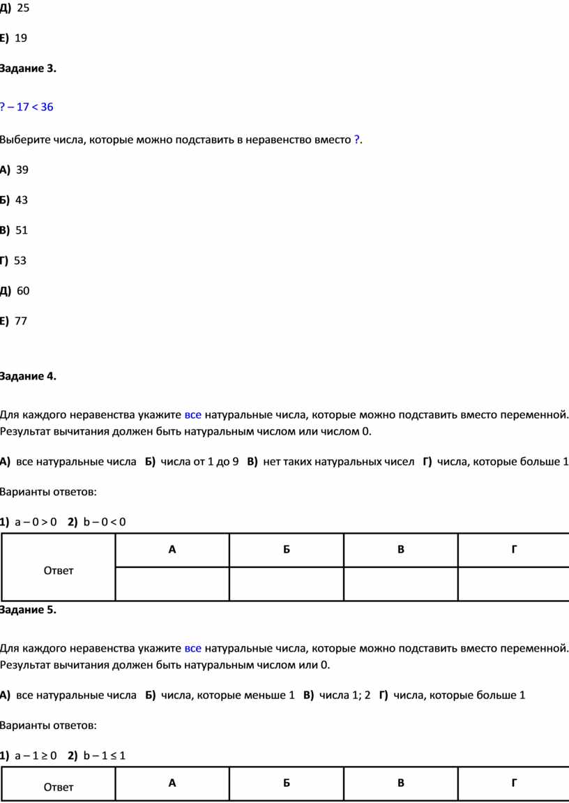 Для каждого неравенства укажите все натуральные числа, которые можно подставить вместо переменной. Результат вычитания должен быть натуральным числом или 0.