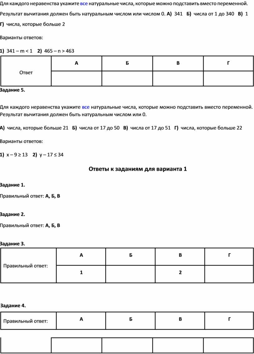 Для каждого неравенства укажите все натуральные числа, которые можно подставить вместо переменной. Результат вычитания должен быть натуральным числом или числом 0. А) 341 Б) числа от 1 до 340 В) 1 Г) числа, которые больше 2