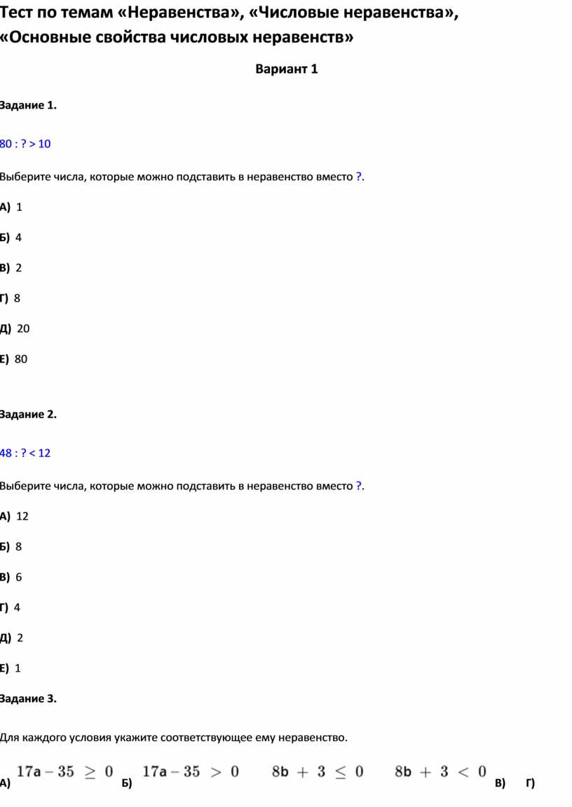 Тест по темам «Неравенства», «Числовые неравенства»,
