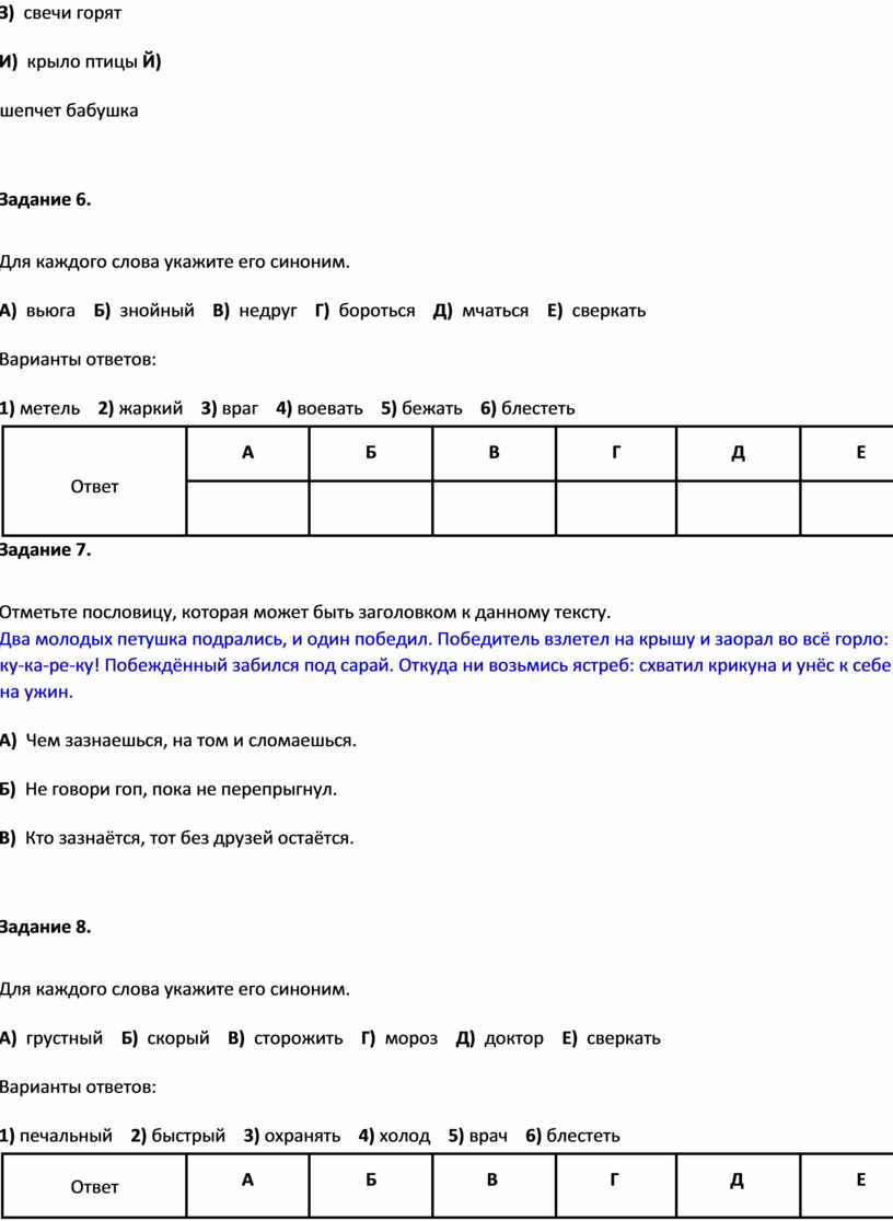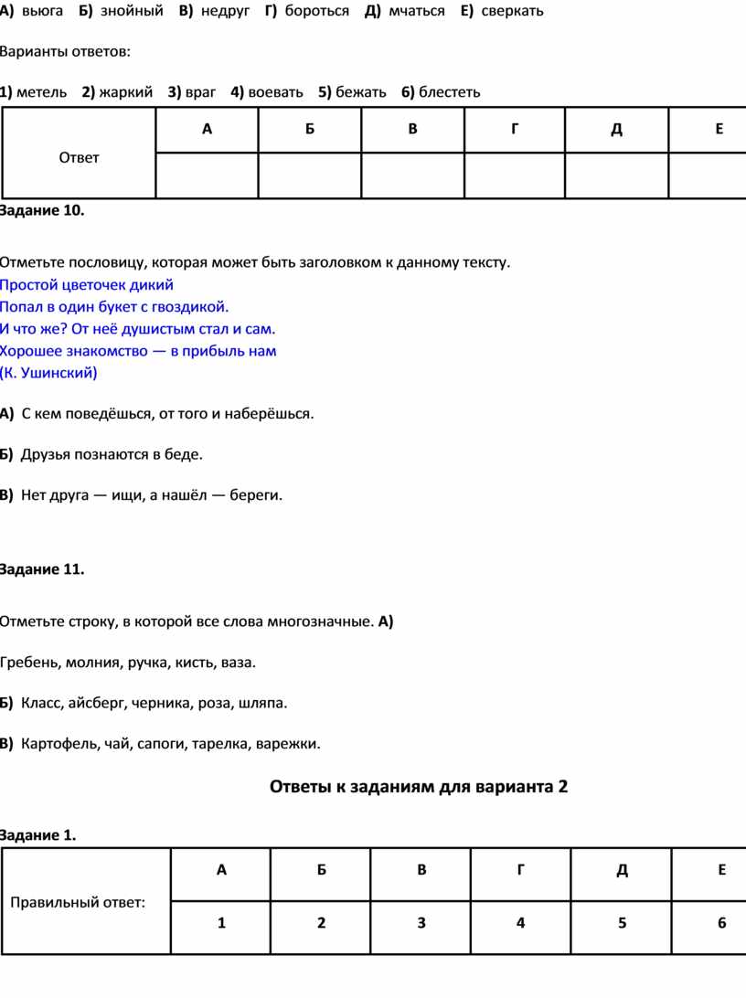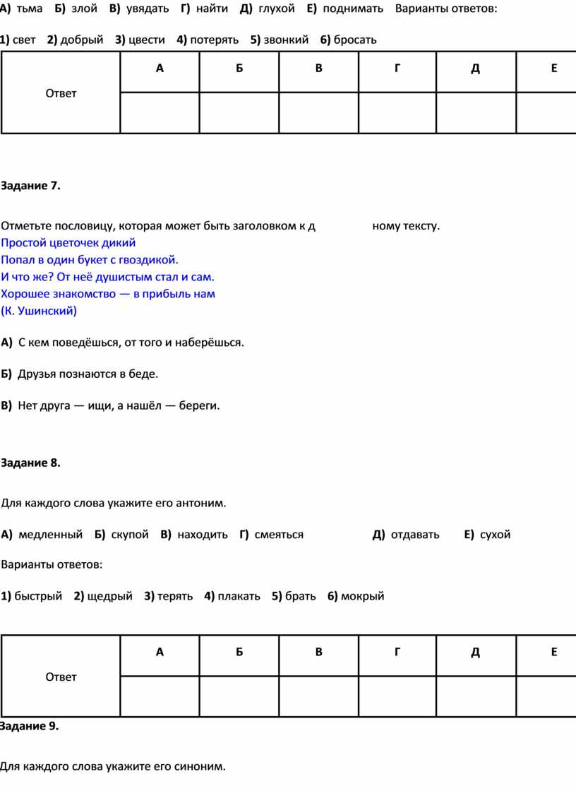 Задание 7. Отметьте пословицу, которая может быть заголовком к д Простой цветочек дикий Попал в один букет с гвоздикой. И что же? От неё душистым стал и сам. Хорошее знакомство — в прибыль нам (К. Ушинский) А) С кем поведёшься, от того и наберёшься. Б) Друзья познаются в беде. В) Нет друга — ищи, а нашёл — береги. Задание 8. Для каждого слова укажите его антоним. А) медленный Б) скупой В) находить Г) смеяться |