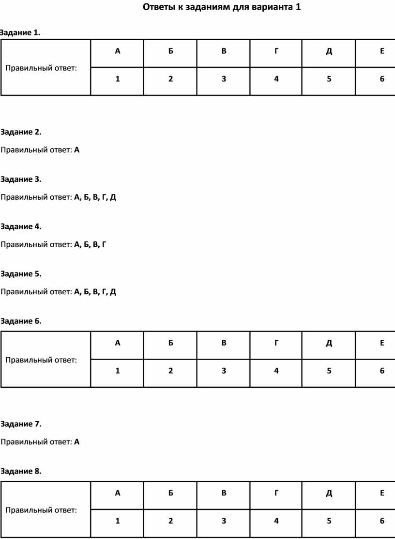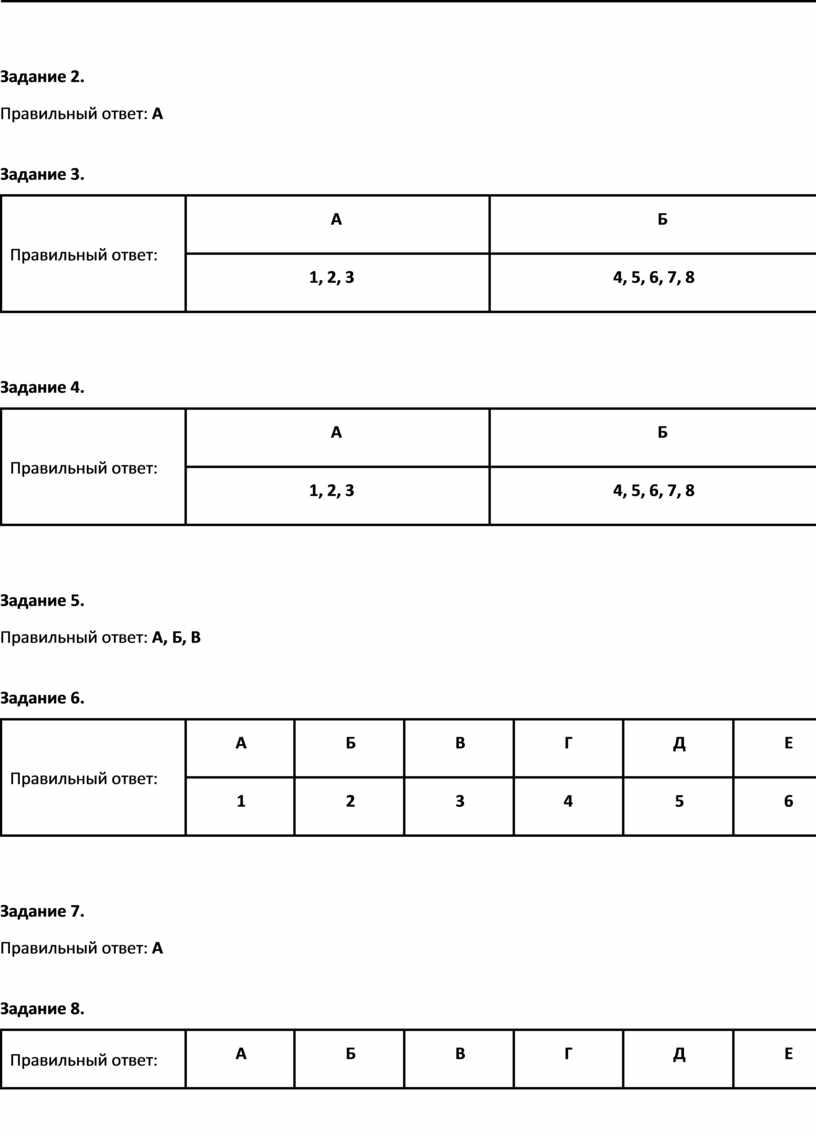 Задание 2. Правильный ответ: А Задание 3. Правильный ответ: А, Б, В, Г, Д Задание 4. Правильный ответ: А, Б, В, Г Задание 5. Правильный ответ: А, Б, В, Г, Д Задание 6. |