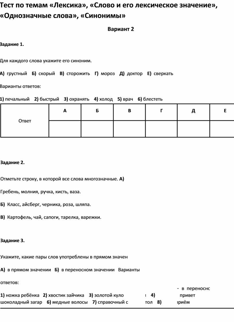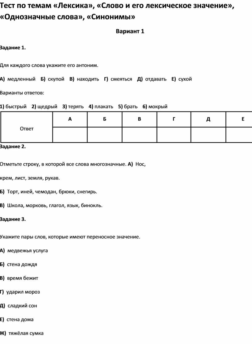 Тест по темам «Лексика», «Слово и его лексическое значение», «Однозначные слова», «Синонимы»