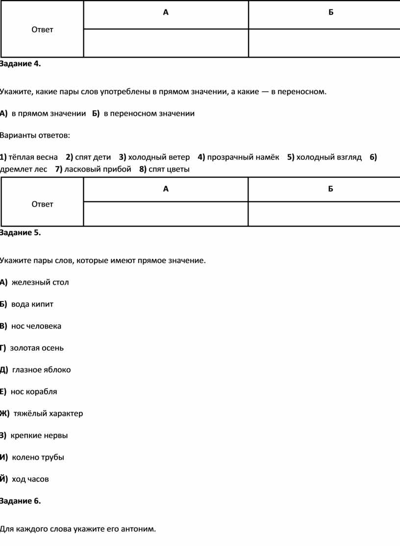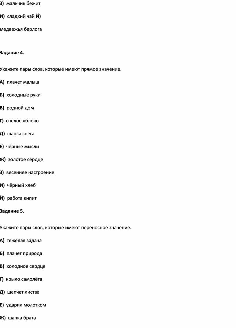Задание 2. Отметьте строку, в которой все слова многозначные. А) Гребень, молния, ручка, кисть, ваза. Б) Класс, айсберг, черника, роза, шляпа. В) Картофель, чай, сапоги, тарелка, варежки. Задание 3. Укажите, какие пары слов употреблены в прямом значен А) в прямом значении Б) в переносном значении Варианты ответов: 1) ножка ребёнка 2) хвостик зайчика 3) золотой куло шоколадный загар 6) медные волосы 7) справочный с |