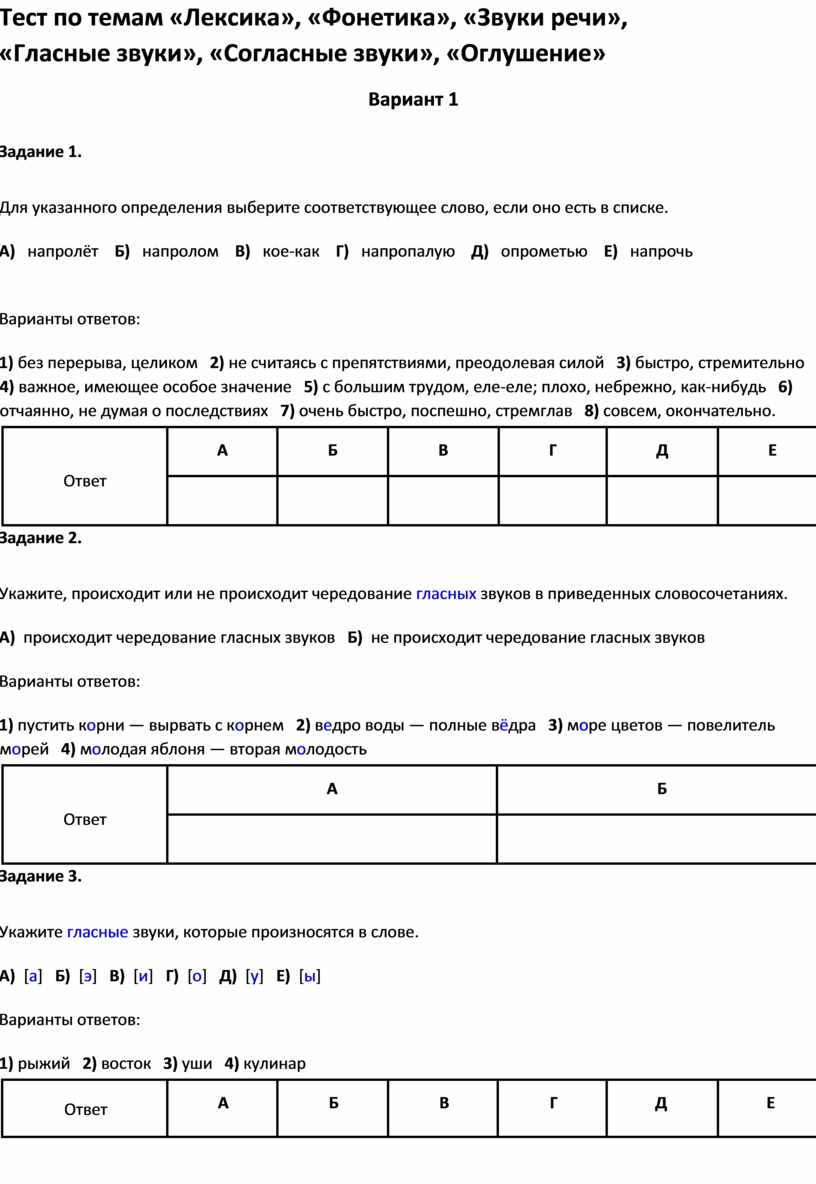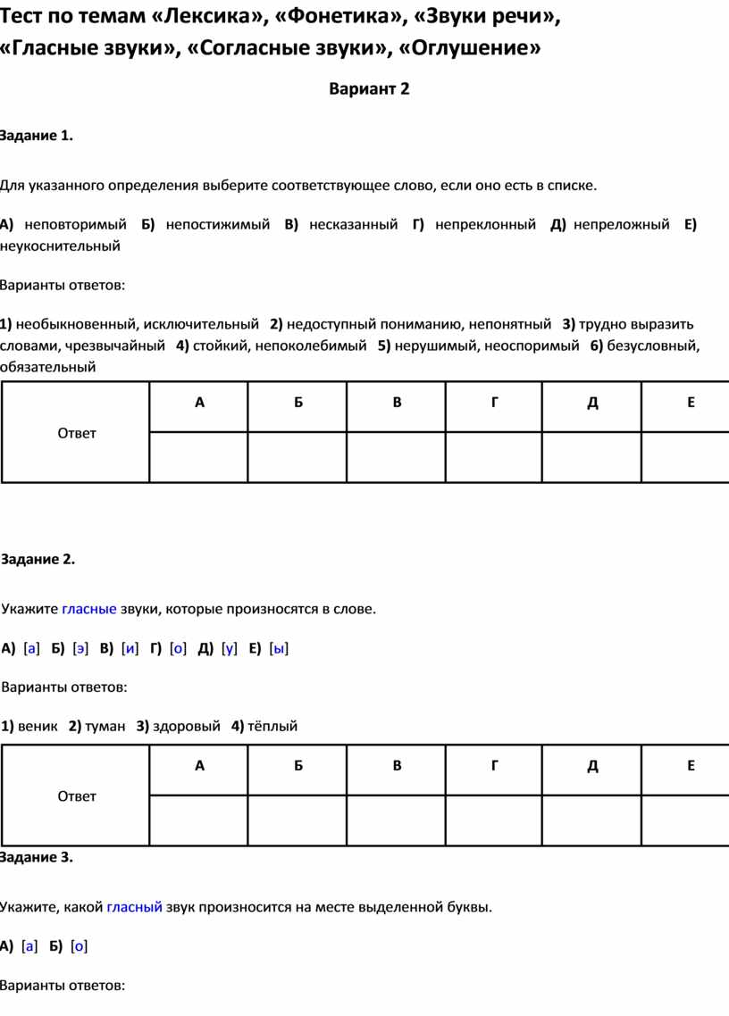 Тест по темам «Лексика», «Фонетика», «Звуки речи»,