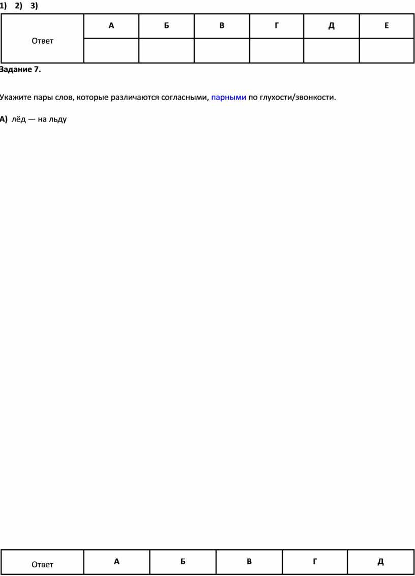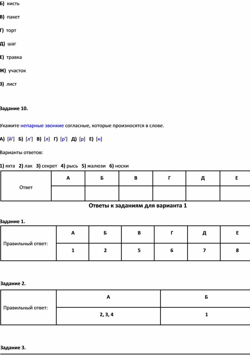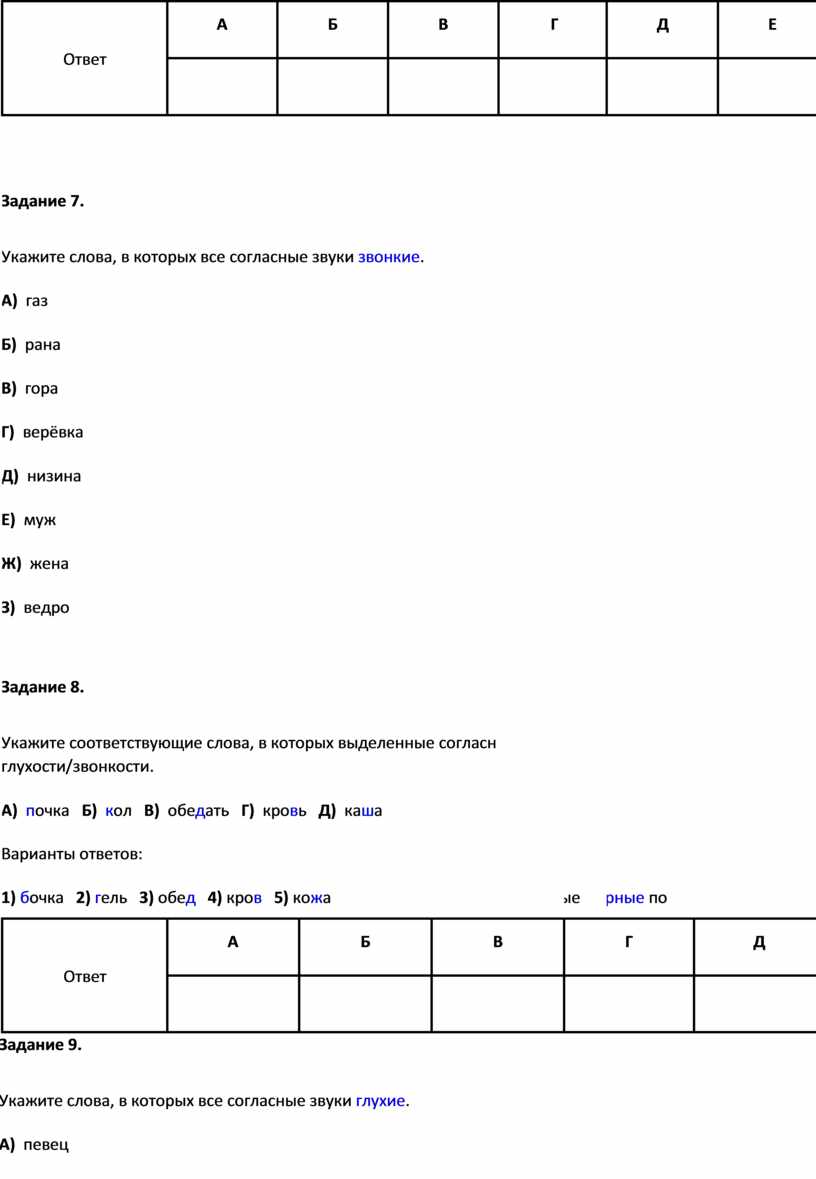 Задание 7. Укажите слова, в которых все согласные звуки звонкие. А) газ Б) рана В) гора Г) верёвка Д) низина Е) муж Ж) жена З) ведро Задание 8. Укажите соответствующие слова, в которых выделенные согласн глухости/звонкости. А) почка Б) кол В) обедать Г) кровь Д) каша Варианты ответов: 1) бочка 2) гель 3) обед 4) кров 5) кожа |
