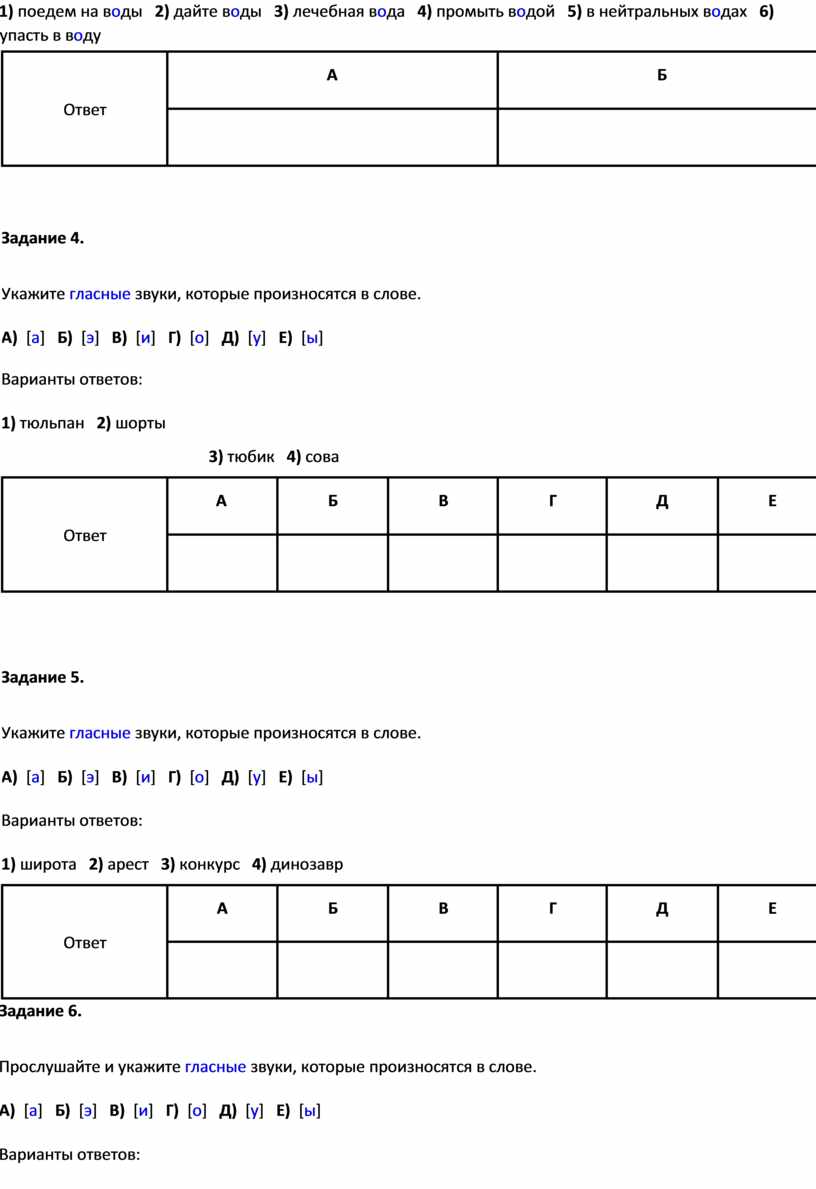 Задание 4. Укажите гласные звуки, которые произносятся в слове. А) [а] Б) [э] В) [и] Г) [о] Д) [у] Е) [ы] |
