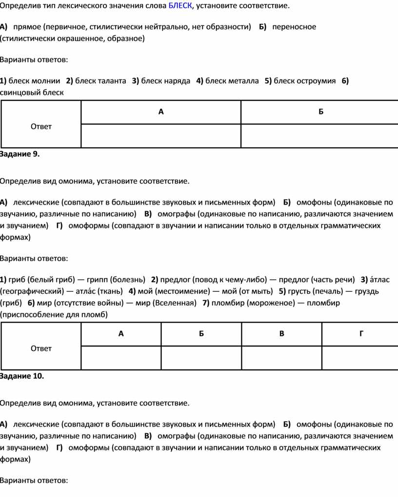 Определив тип лексического значения слова БЛЕСК, установите соответствие.