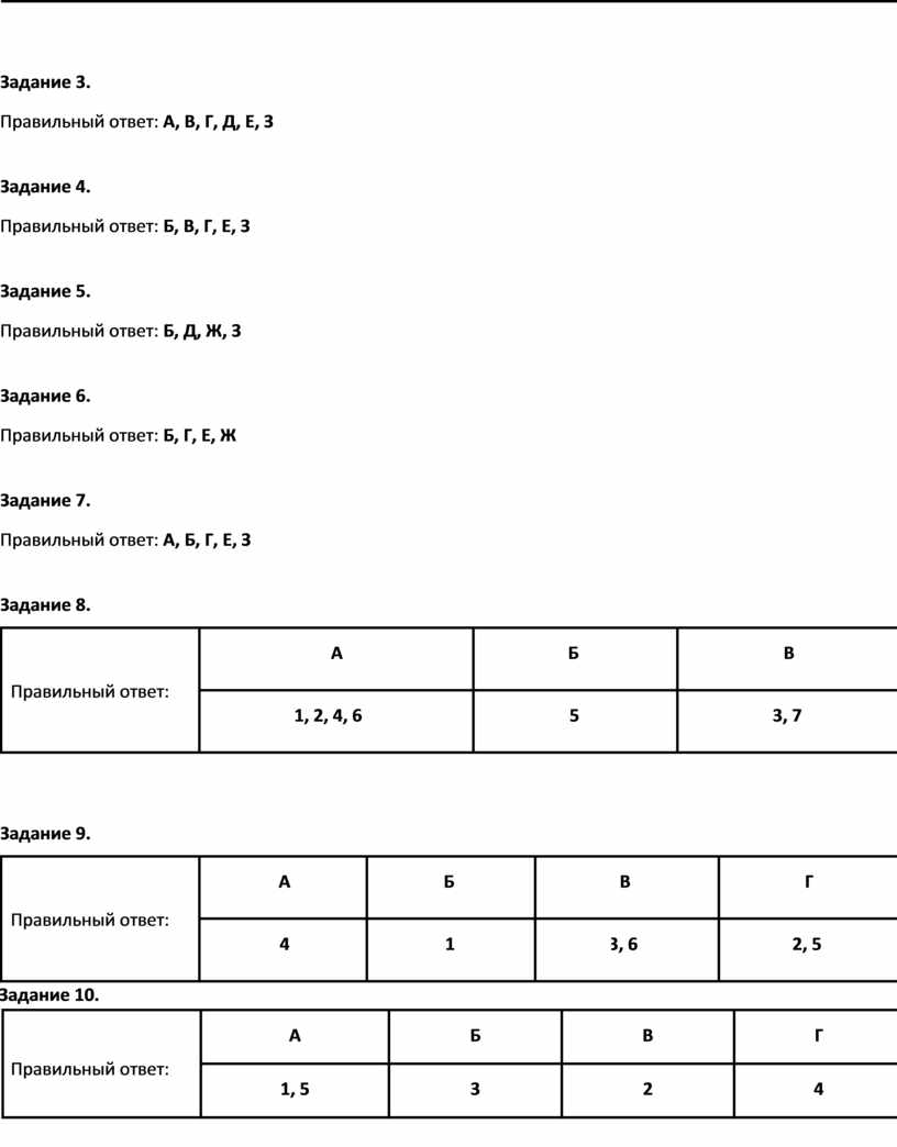 Задание 3. Правильный ответ: А, В, Г, Д, Е, З Задание 4. Правильный ответ: Б, В, Г, Е, З Задание 5. Правильный ответ: Б, Д, Ж, З Задание 6. Правильный ответ: Б, Г, Е, Ж Задание 7. Правильный ответ: А, Б, Г, Е, З Задание 8. |