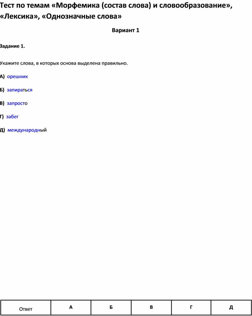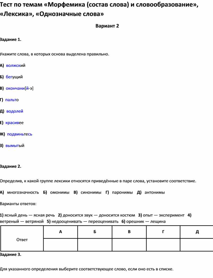 Тест по темам «Морфемика (состав слова) и словообразование», «Лексика», «Однозначные слова»