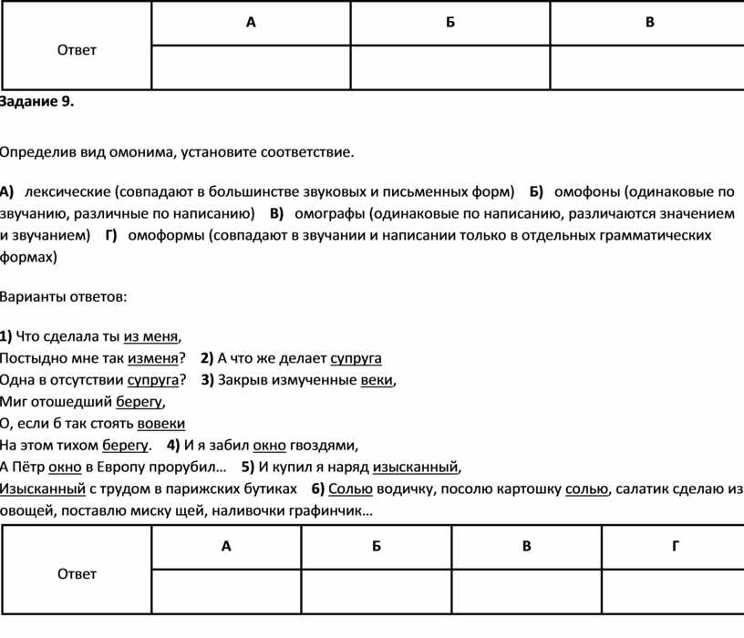 А) лексические (совпадают в большинстве звуковых и письменных форм) Б) омофоны (одинаковые по звучанию, различные по написанию) В) омографы (одинаковые по написанию, различаются значением и звучанием) Г) омоформы (совпадают в звучании и написании только в отдельных грамматических формах)