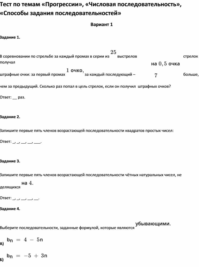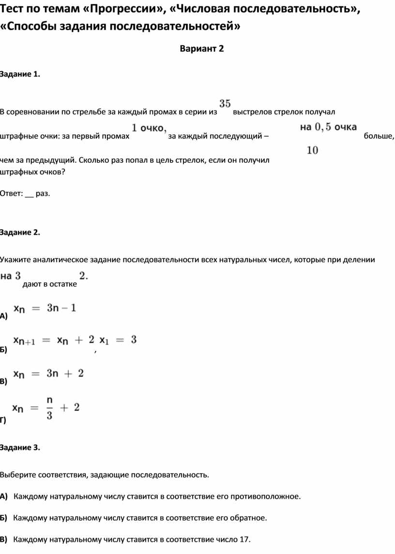 Тест по темам «Прогрессии», «Числовая последовательность», «Способы задания последовательностей»