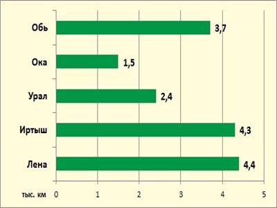 На диаграмме показаны длины некоторых рек в тыс. км. С помощью диаграммы ответьте на вопросы:
