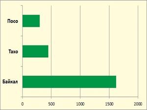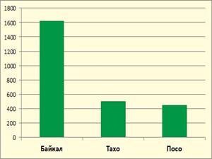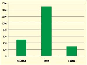 Наибольшая глубина озера Байкал 1620 м, озера Тахо 501 м, озера Посо 450 м. Выберите диаграмму, которая соответствует данному условию.