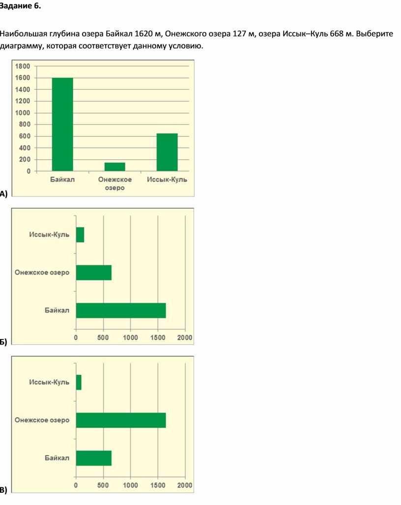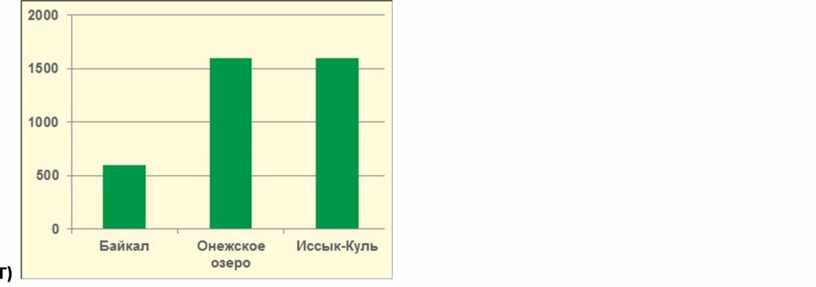 Наибольшая глубина озера Байкал 1620 м, Онежского озера 127 м, озера Иссык–Куль 668 м. Выберите диаграмму, которая соответствует данному условию.
