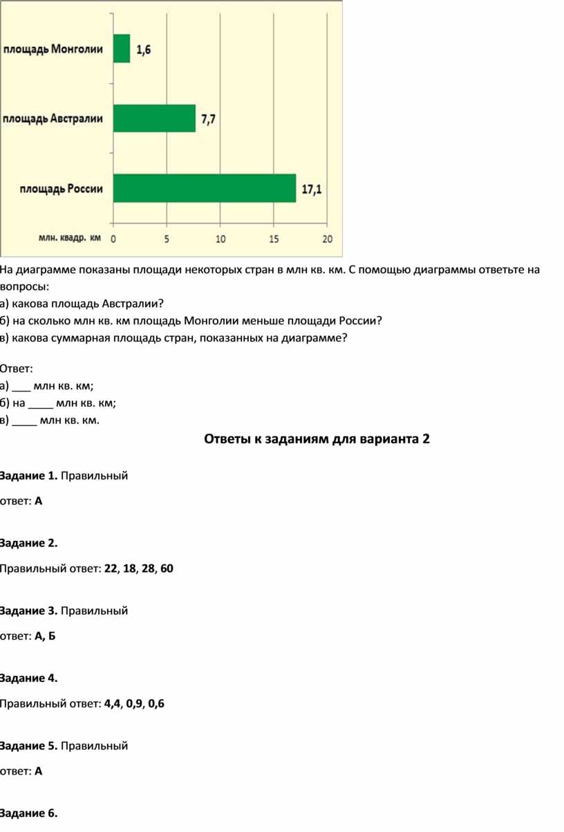На диаграмме показаны площади некоторых стран в млн кв. км. С помощью диаграммы ответьте на вопросы: