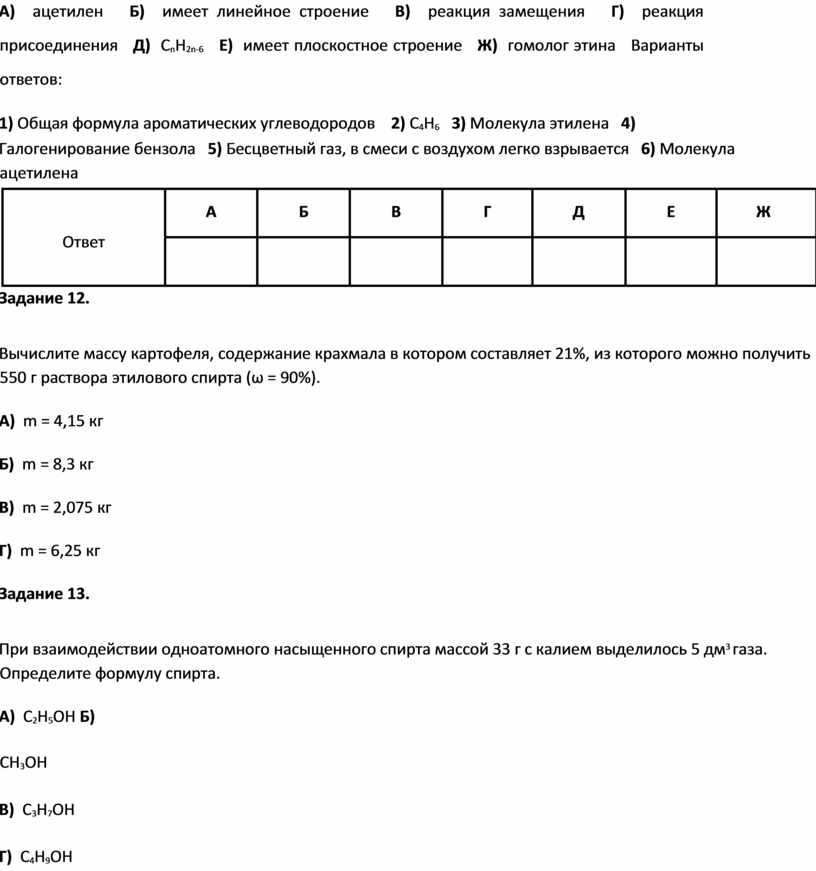 А) ацетилен Б) имеет линейное строение В) реакция замещения Г) реакция присоединения Д) СnH2n-6 Е) имеет плоскостное строение Ж) гомолог этина Варианты ответов: