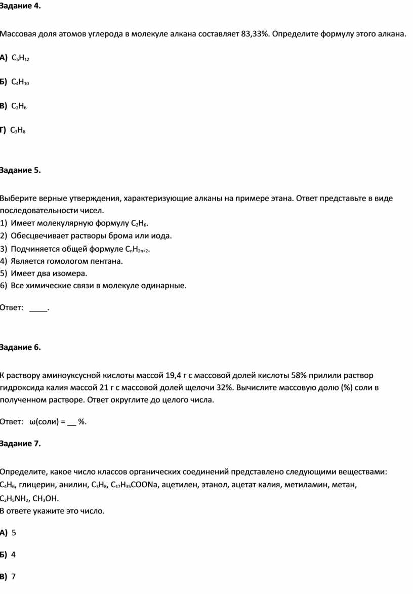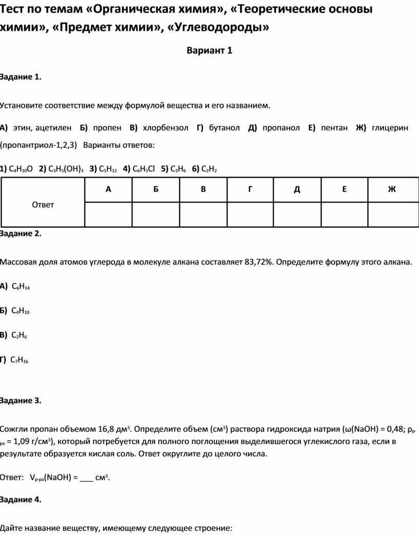 Тест по темам «Органическая химия», «Теоретические основы химии», «Предмет химии», «Углеводороды»