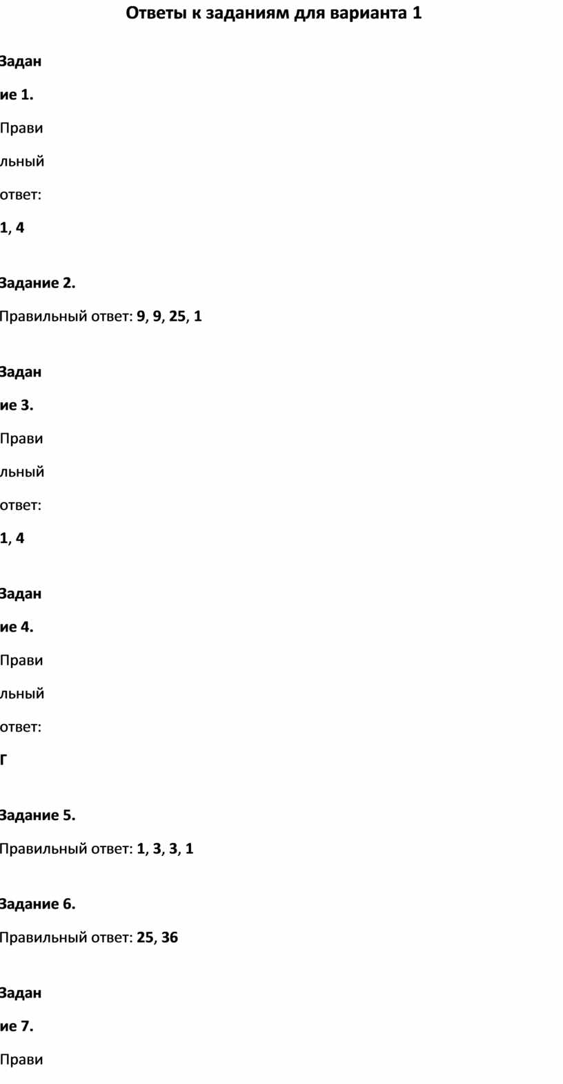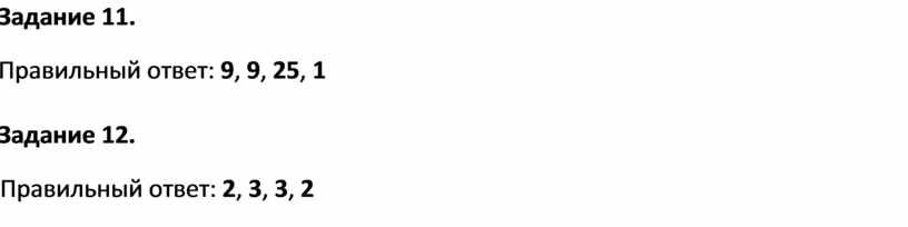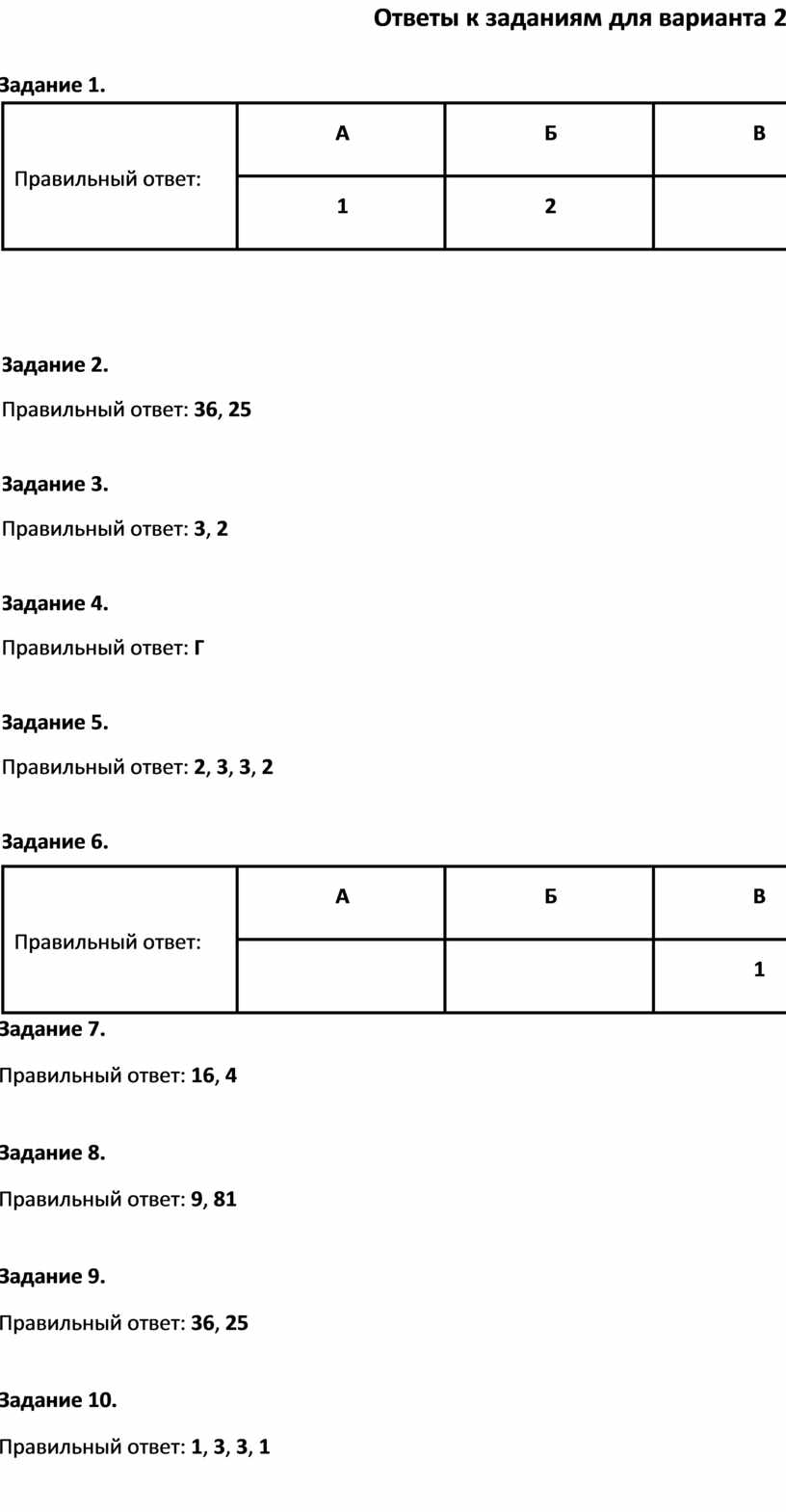 Задание 2. Правильный ответ: 36, 25 Задание 3. Правильный ответ: 3, 2 Задание 4. Правильный ответ: Г Задание 5. Правильный ответ: 2, 3, 3, 2 Задание 6. |
