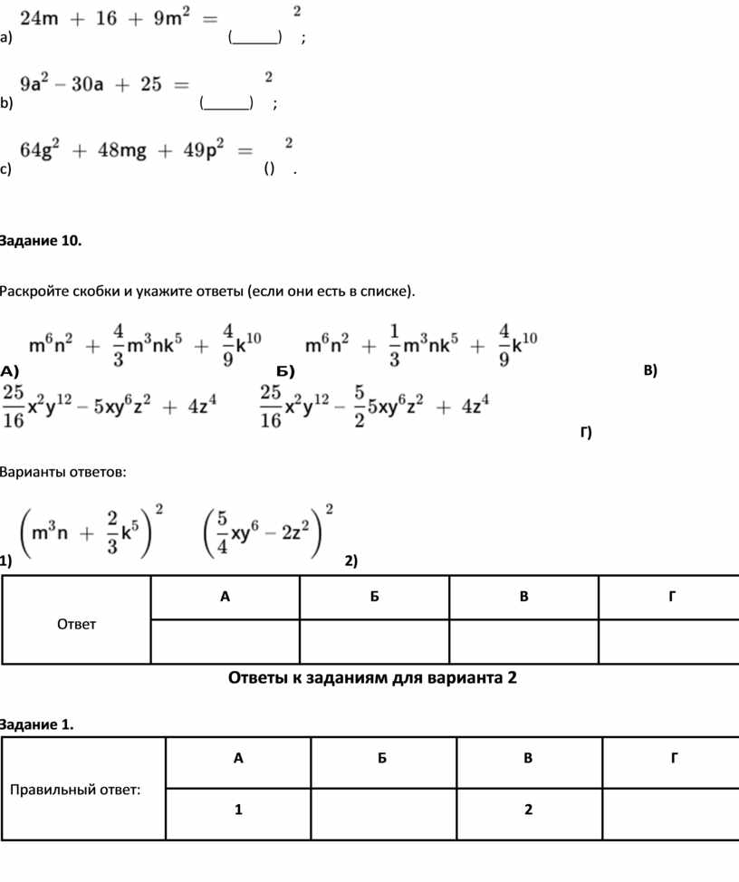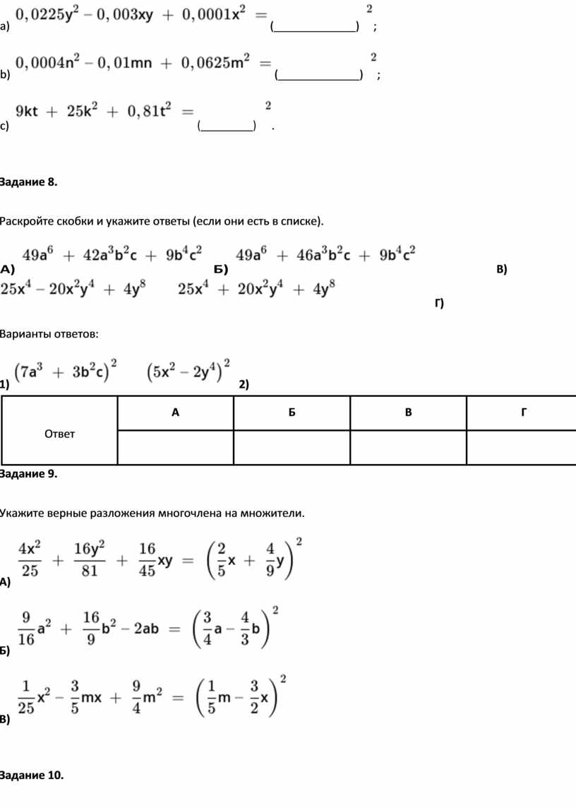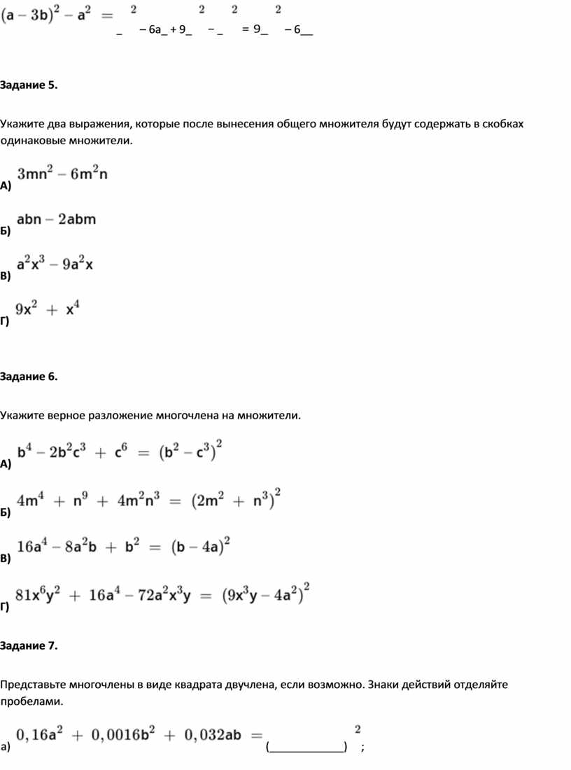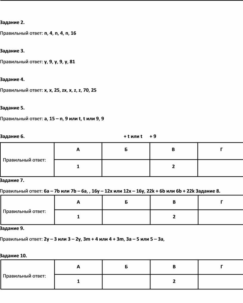 Задание 2. Правильный ответ: n, 4, n, 4, n, 16 Задание 3. Правильный ответ: y, 9, y, 9, y, 81 Задание 4. Правильный ответ: x, x, 25, zx, x, z, z, 70, 25 Задание 5. Правильный ответ: a, 15 – n, 9 или t, t или 9, 9 Задание 6. |