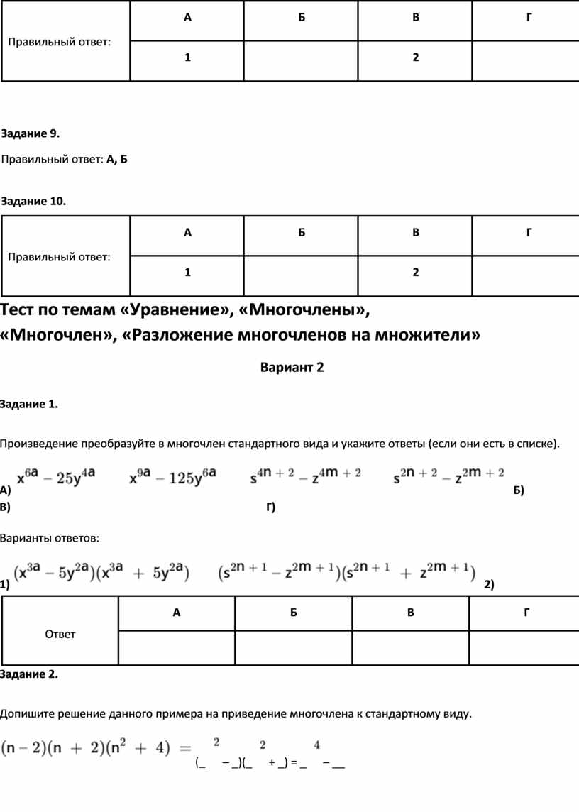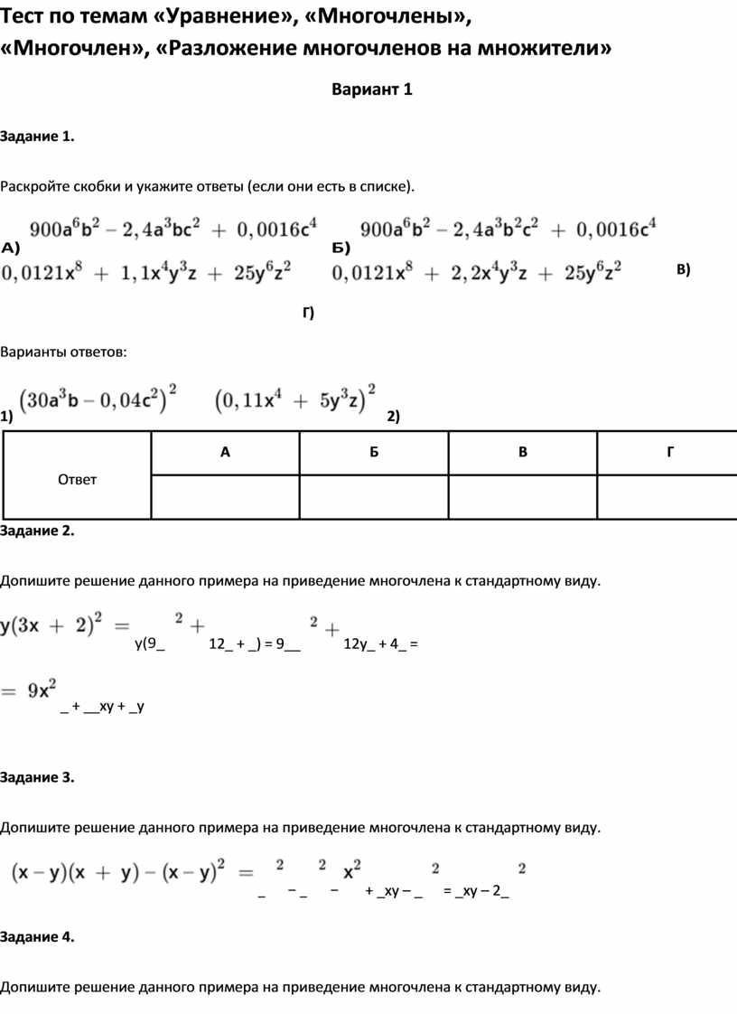 Тест по темам «Уравнение», «Многочлены»,