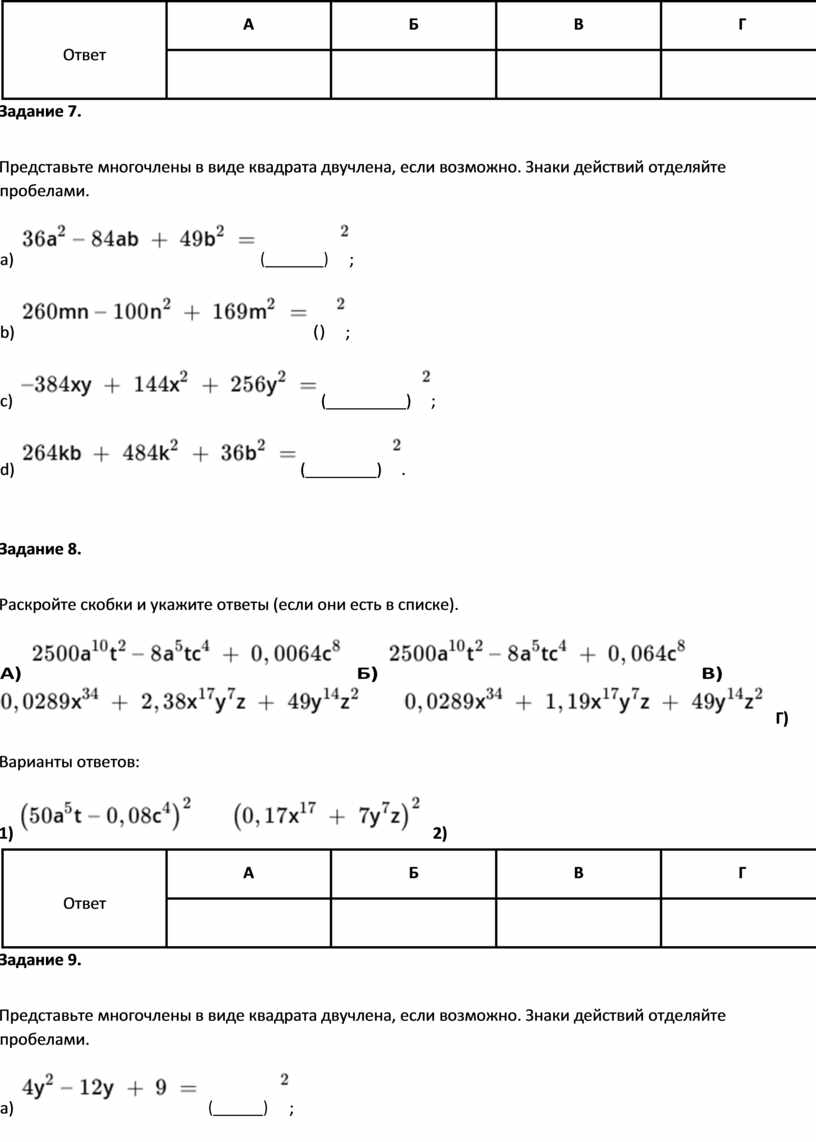 Представьте многочлены в виде квадрата двучлена, если возможно. Знаки действий отделяйте пробелами.