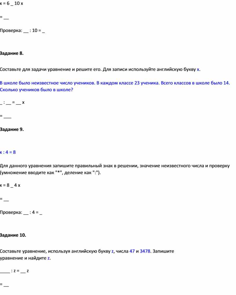 Составьте уравнение, используя английскую букву z, числа 47 и 3478. Запишите уравнение и найдите z.
