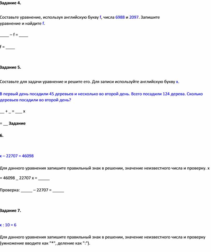 Составьте уравнение, используя английскую букву f, числа 6988 и 2097. Запишите уравнение и найдите f.