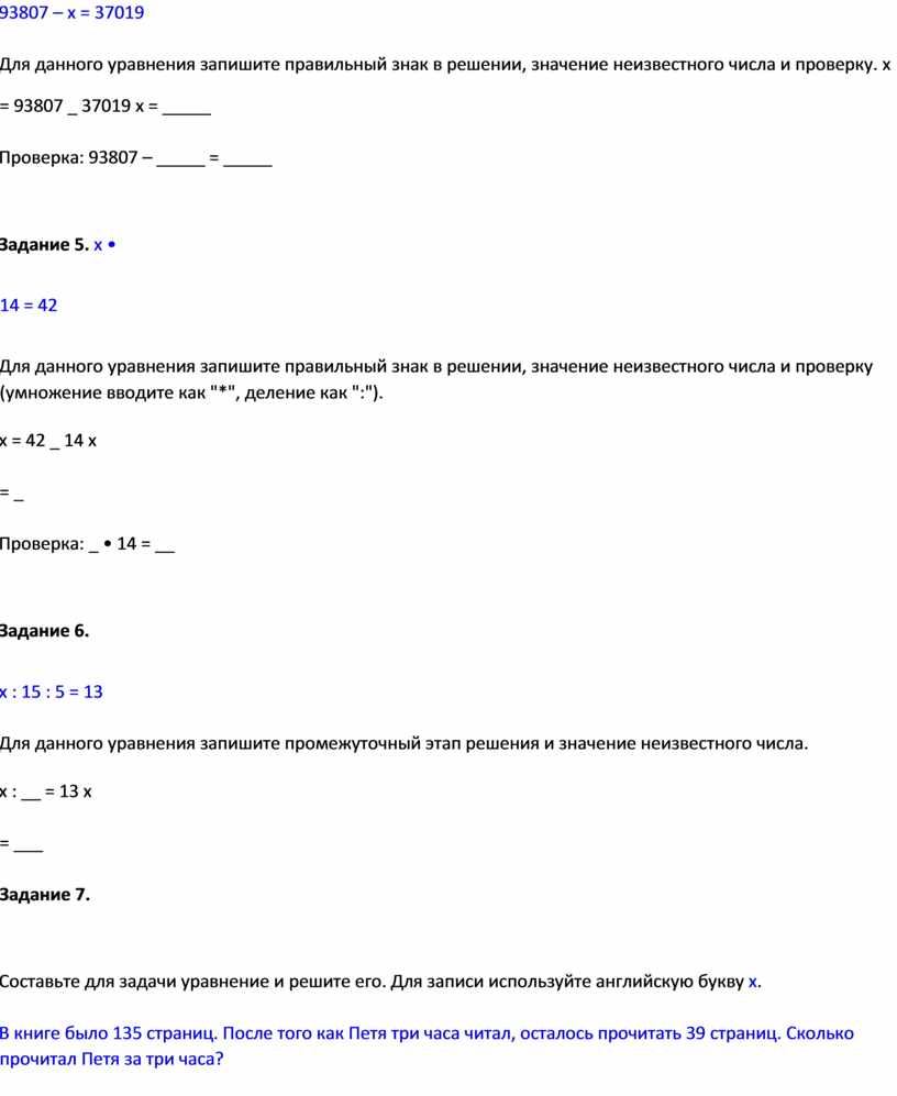 Для данного уравнения запишите правильный знак в решении, значение неизвестного числа и проверку. x = 93807 _ 37019 x = _____